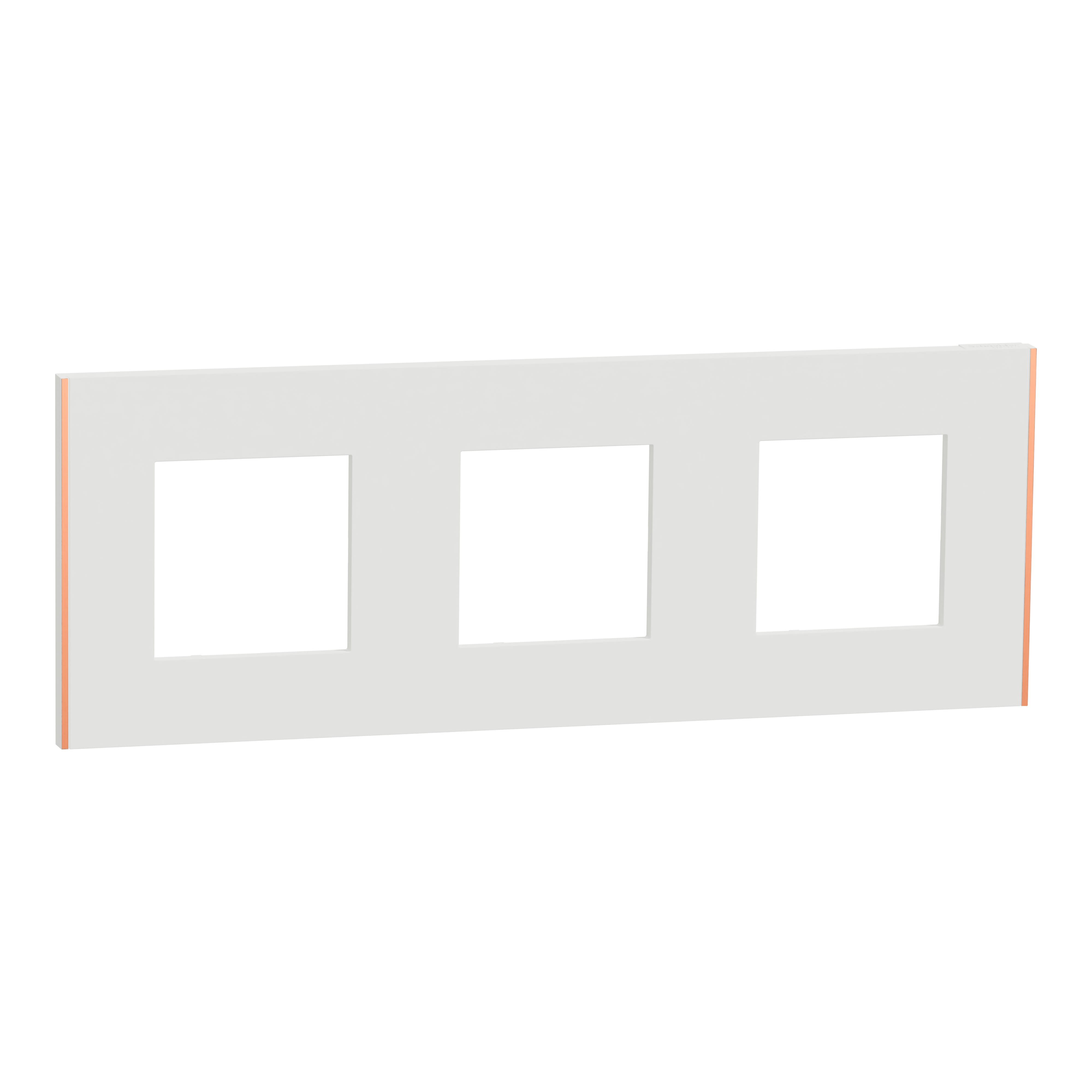 NU600642 se compose d'une plaque 3 postes de couleur blanc (RAL9003) avec deux liserés cuivres de part et d'autre. Il sera à associer et à clipser sur un support de fixation (commençant par NU700) qui maintient le mécanisme ou la fonction Unica (prise, interrupteur, ...).