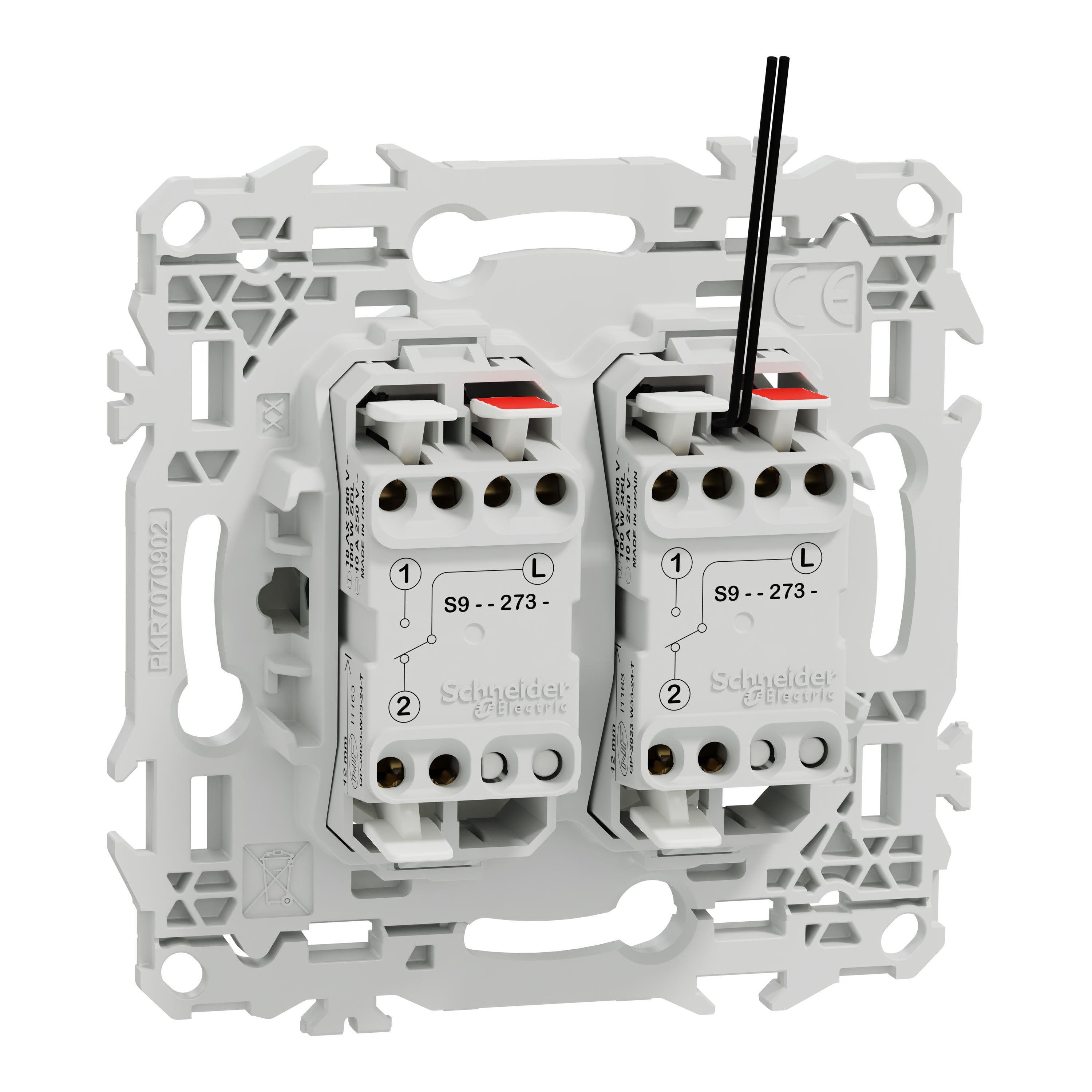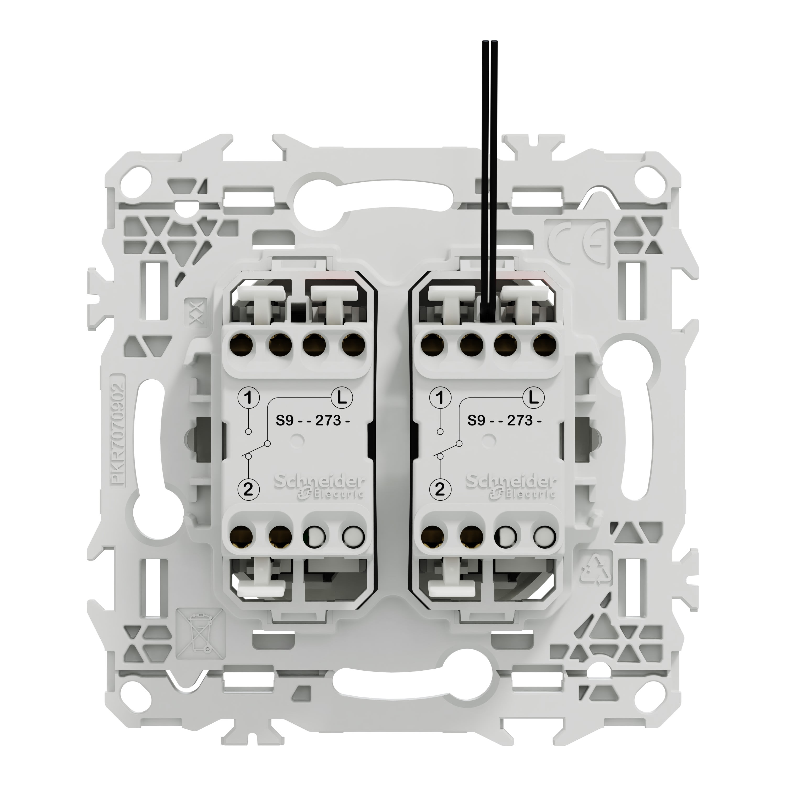 La fixation du mécanisme est facile et robuste sur tout type de boîte d'encastrement grâce à son support rigide à vis ou à griffes clipsables en option idéales pour la rénovation. Le produit dispose de 2x3 bornes automatiques jusqu'à 2 câbles de 1,5mm² rigides ou souples & multibrins pour chaque pôle, pour une installation plus rapide et fiable, réduisant le temps de montage et minimisant les risques d’erreur.