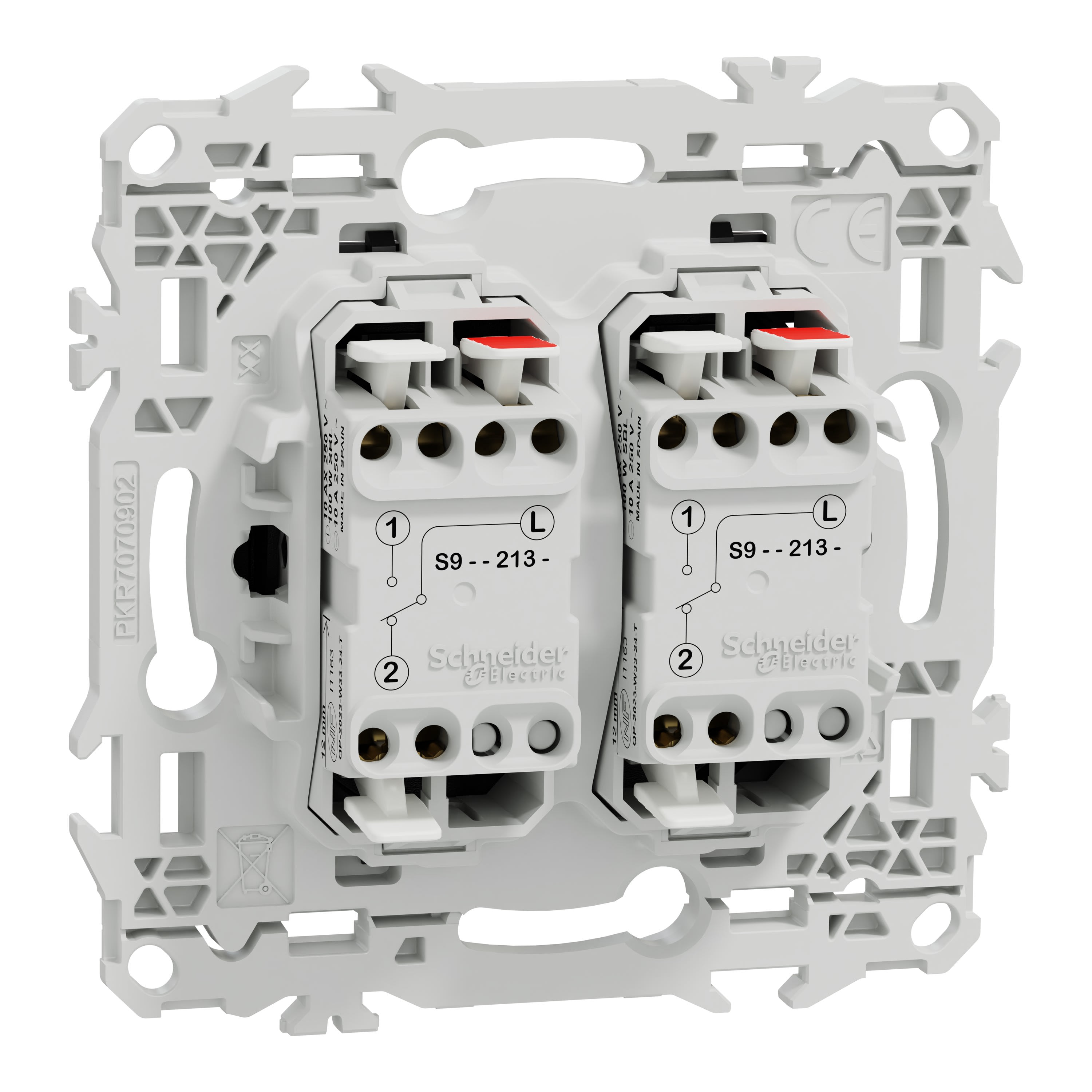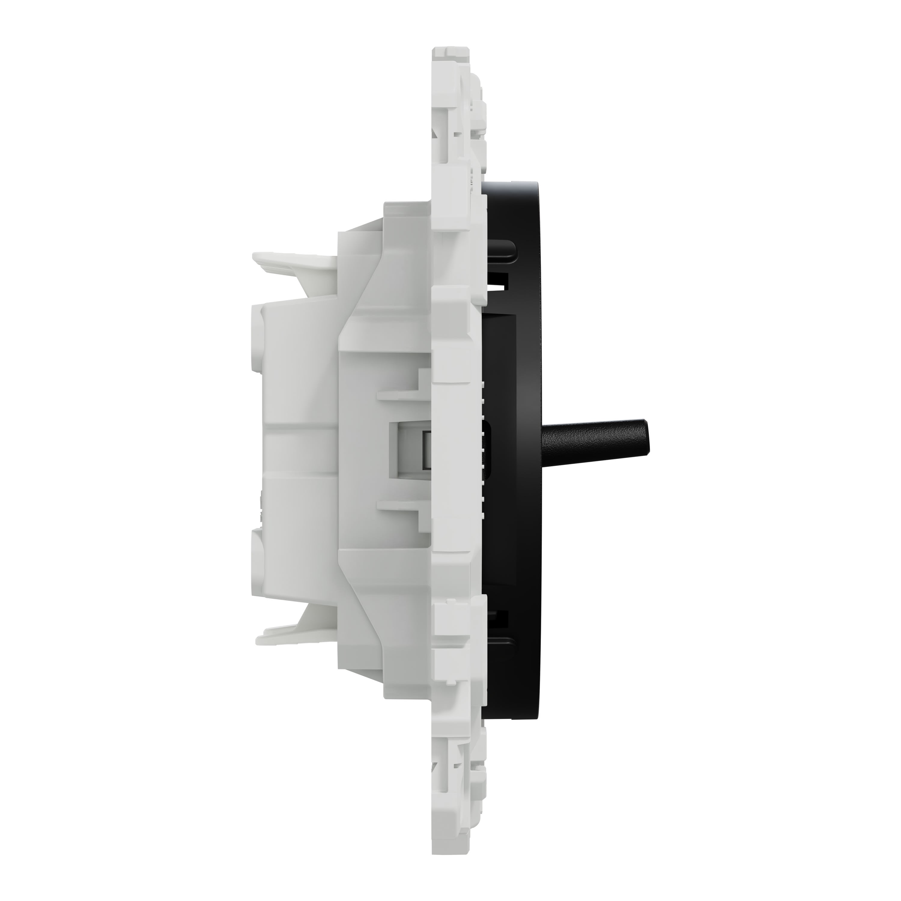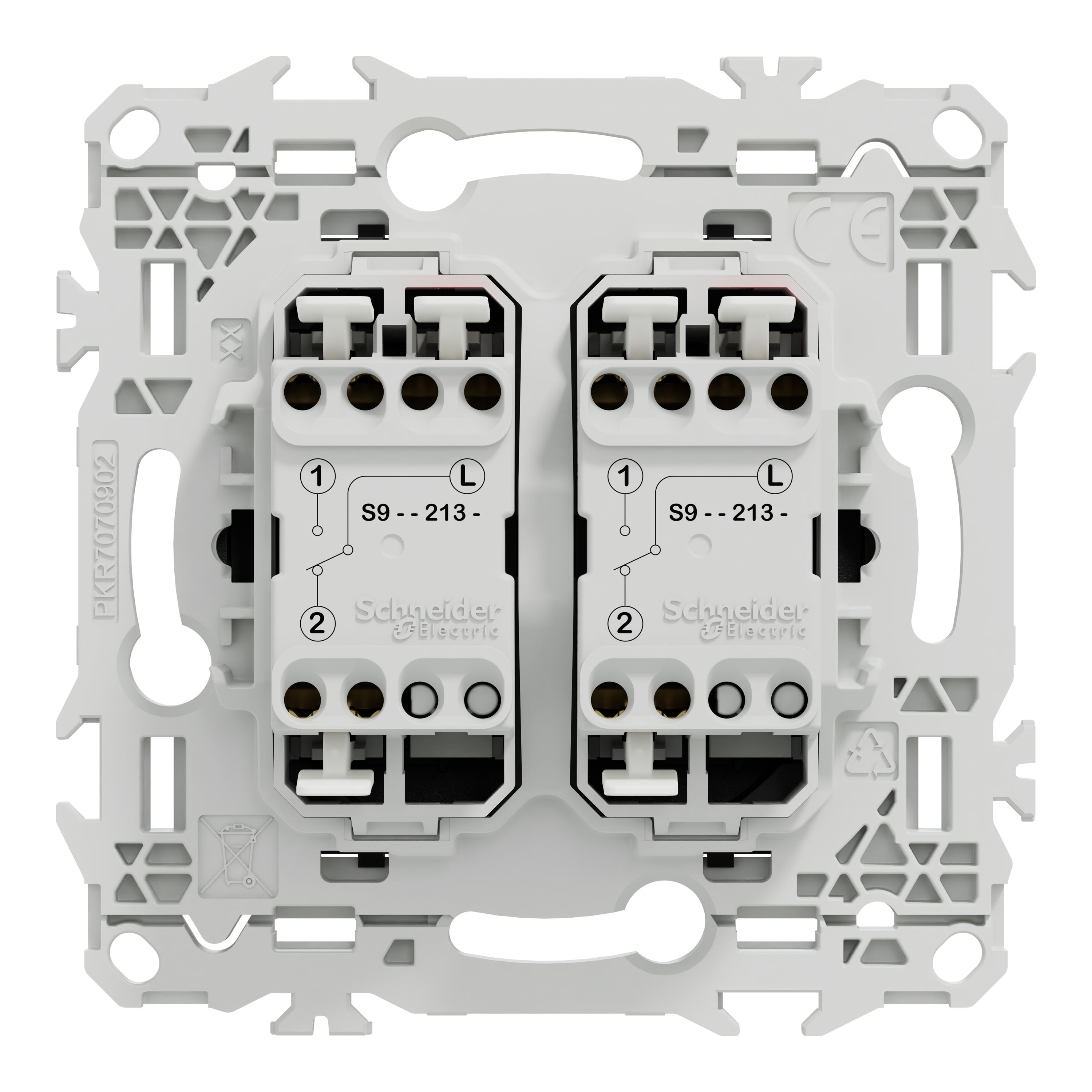 La fixation du mécanisme est facile et robuste sur tout type de boîte d'encastrement grâce à son support rigide à vis ou à griffes clipsables en option idéales pour la rénovation. Le produit dispose de 2x3 bornes automatiques jusqu'à 2 câbles de 1,5mm² rigides ou souples & multibrins pour chaque pôle, pour une installation plus rapide et fiable, réduisant le temps de montage et minimisant les risques d’erreur.