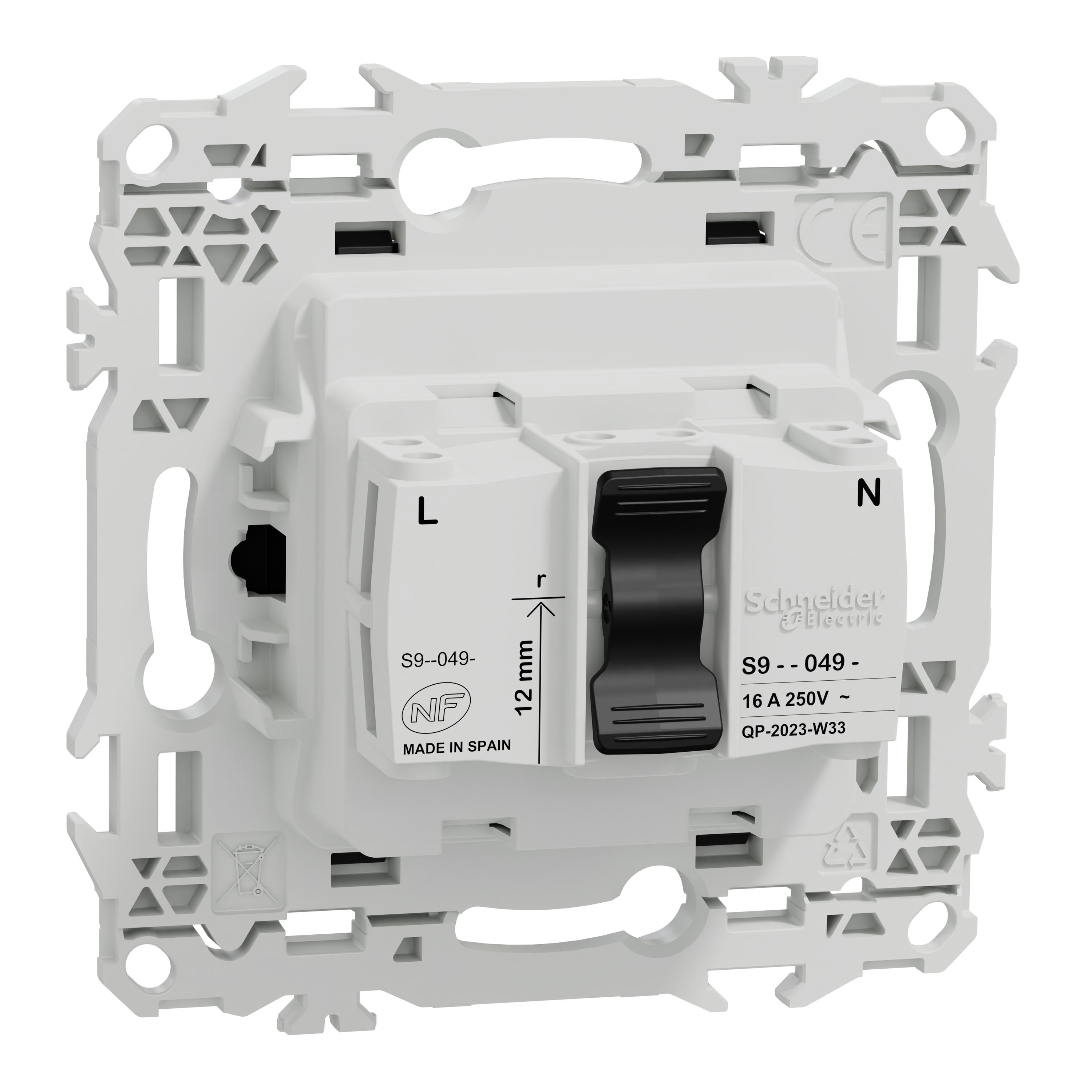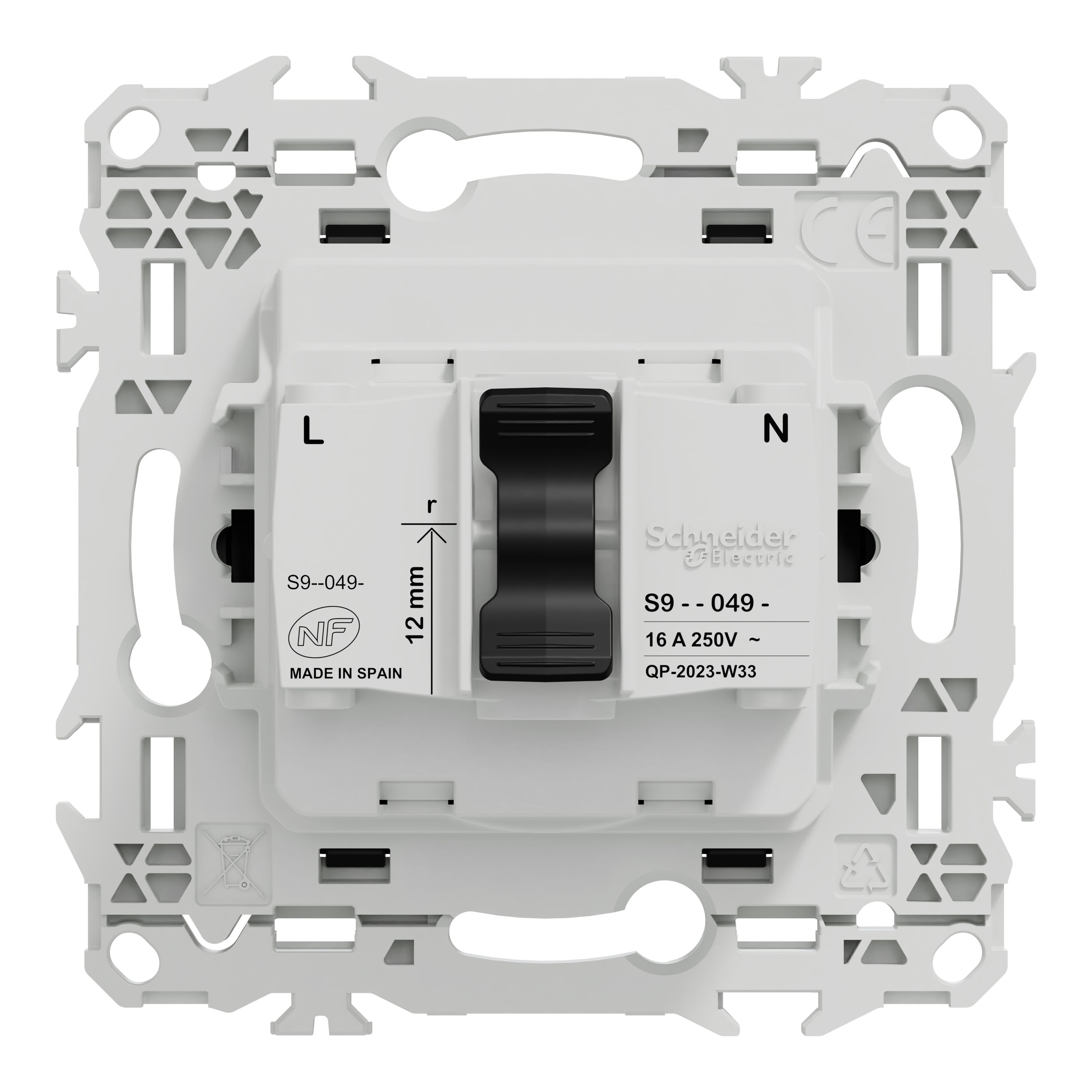 La fixation du mécanisme est facile et robuste sur tout type de boîte d'encastrement grâce à son support rigide à vis ou à griffes clipsables en option idéales pour la rénovation. Le produit dispose d'une connexion rapide et fiable sans outil grâce aux bornes automatiques sans vis jusqu'à 4 câbles de 2,5mm² rigides ou souples & multibrins pour chaque pôle.