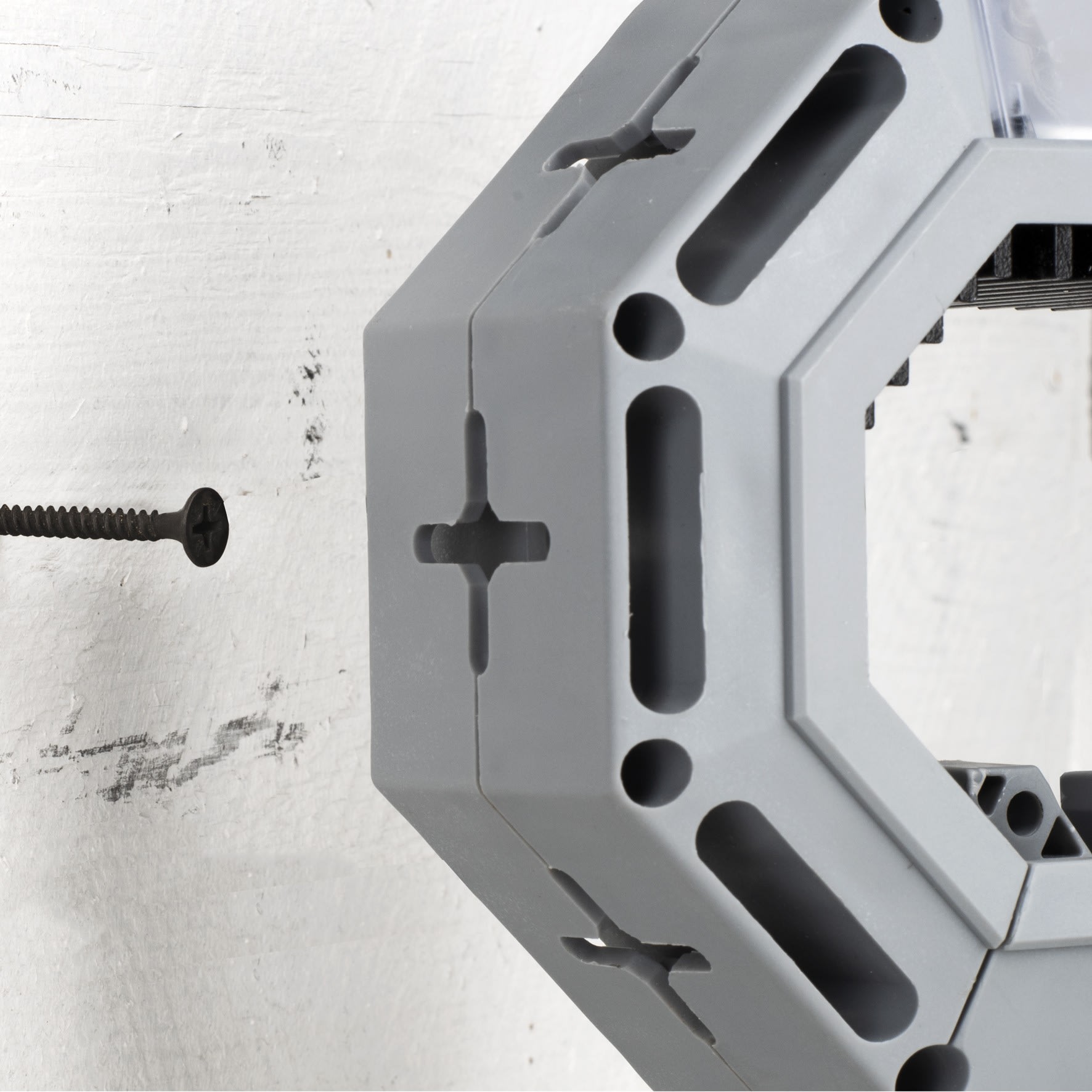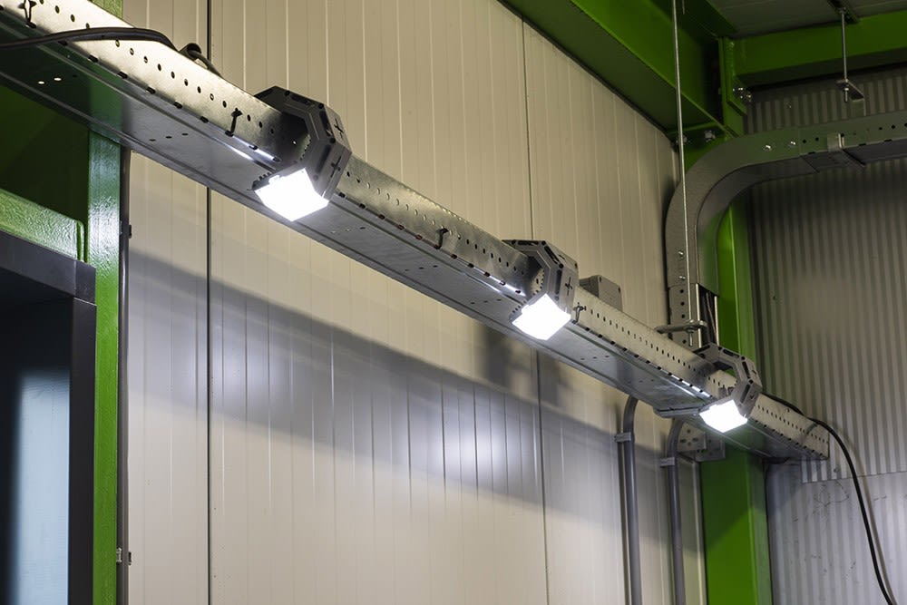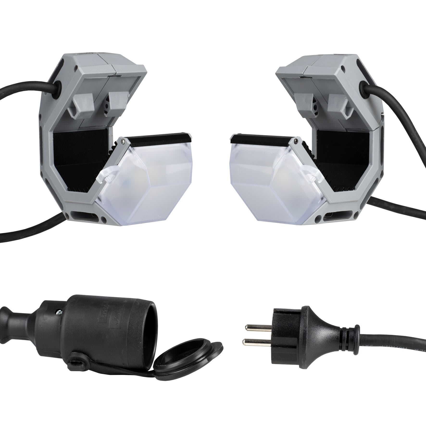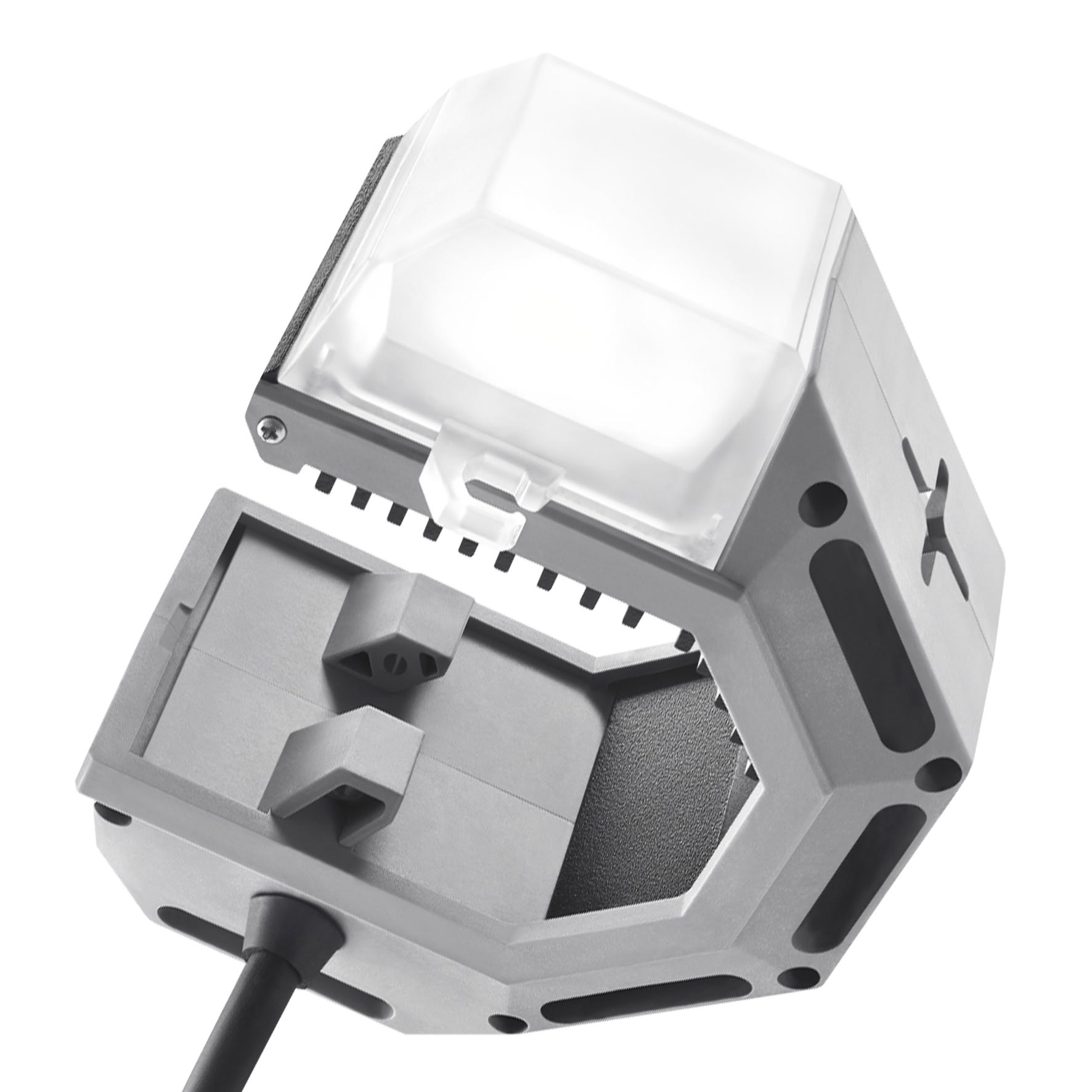 Alignement de projecteurs pour chantiers, idéale pour éclairer de grandes surfaces, des chemins d'évacuation et des cages d'escalier. De nombreuses possibilités de montage simples et universelles: en suspension ou en empilement, à la verticale ou à la