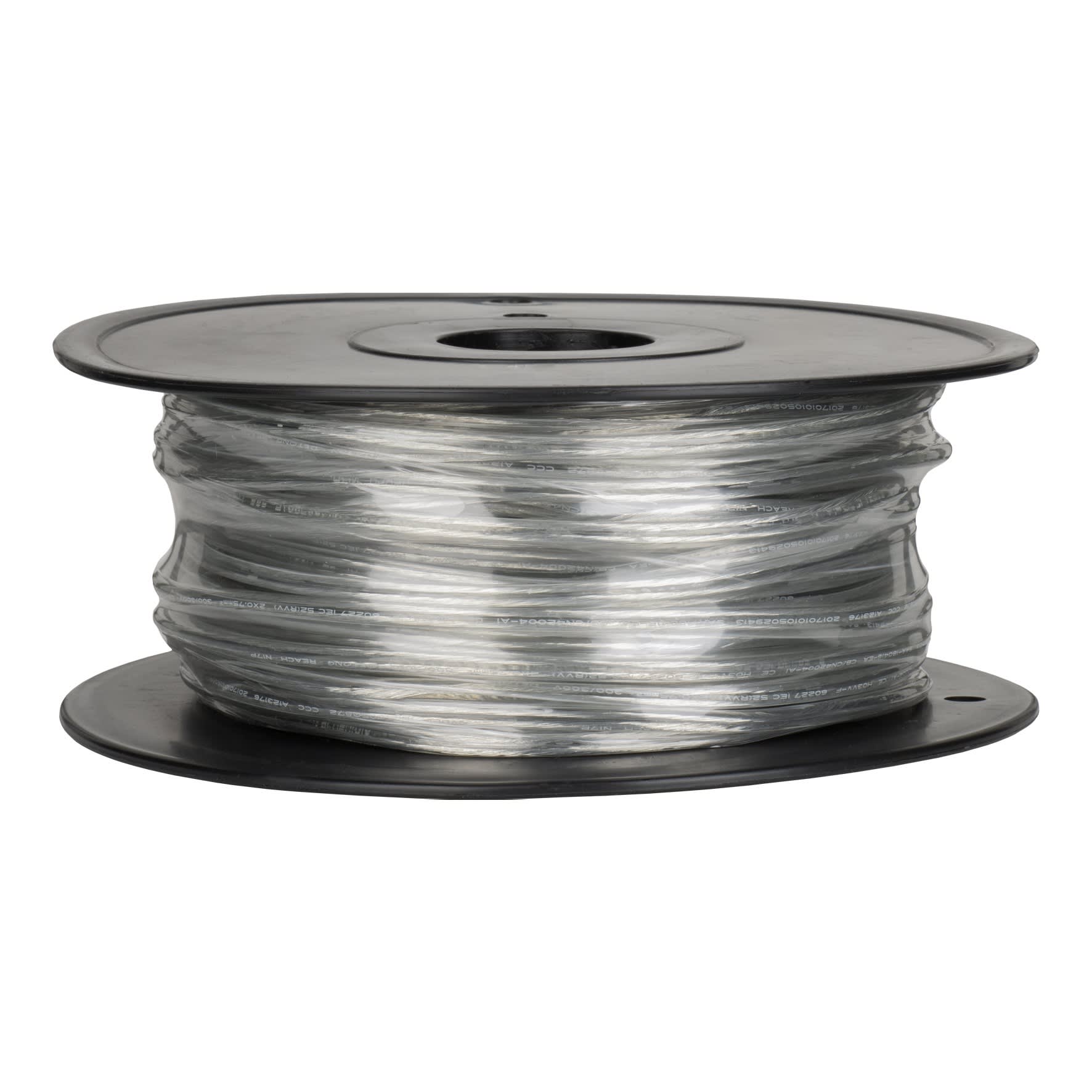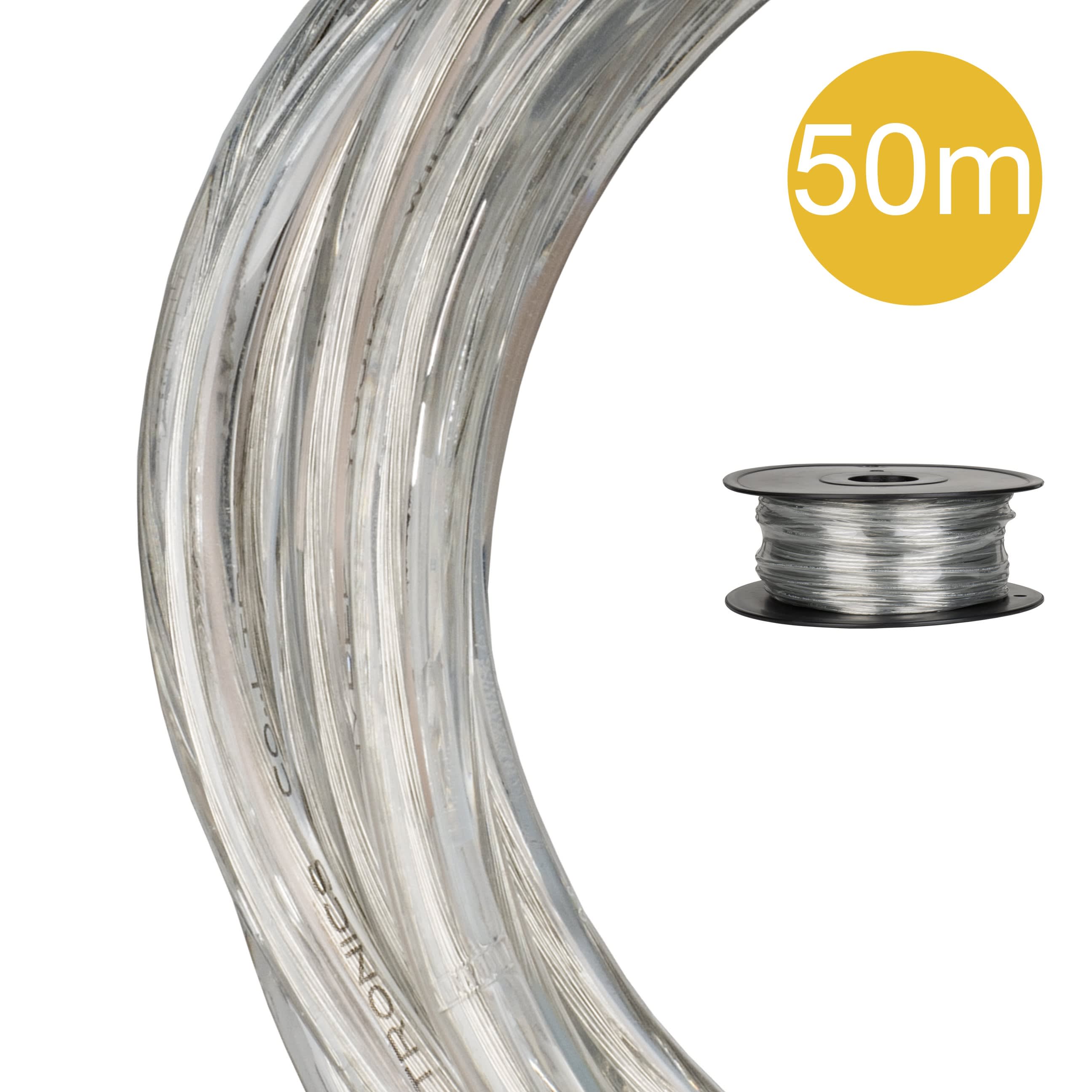 Câble PVC rond transparent à 2 fils conducteurs pour un effet décoratif spécial. Livré sur un rouleau de 50 mètres.