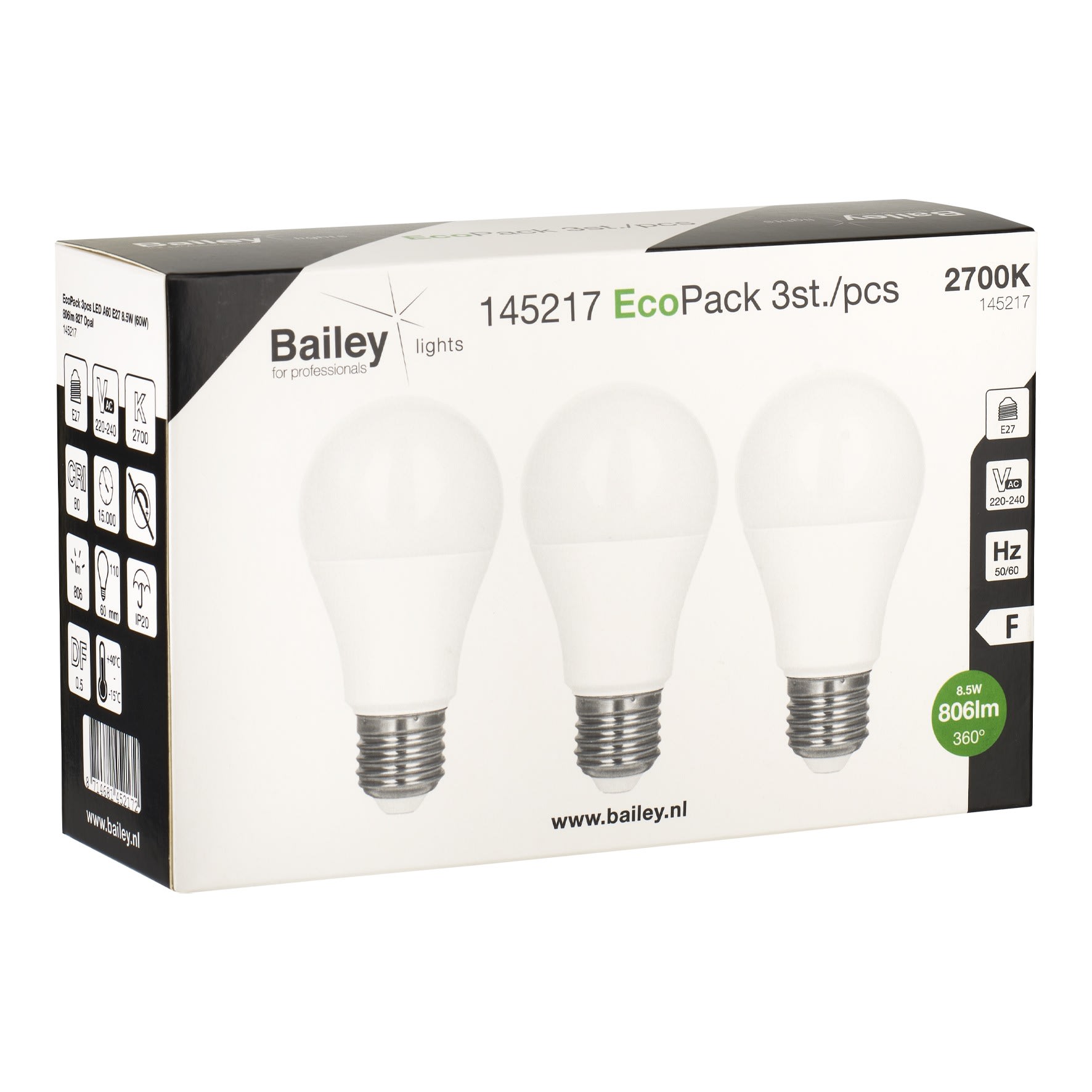 Bailey - EcoPack 3pcs Ecobasic LED Standard A60 E27 8.5W 2700K Opale 806lm (60W) 230V - 145217