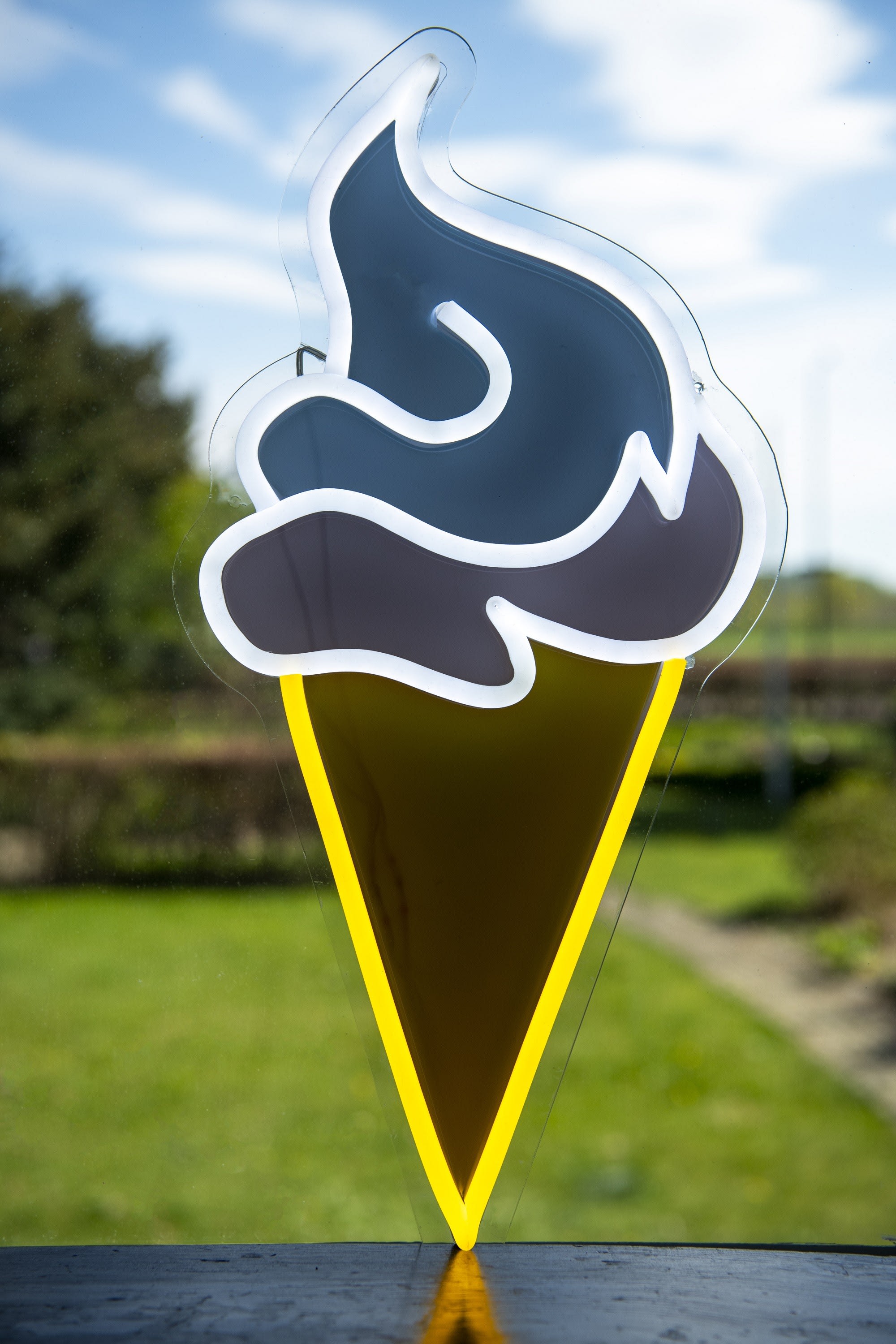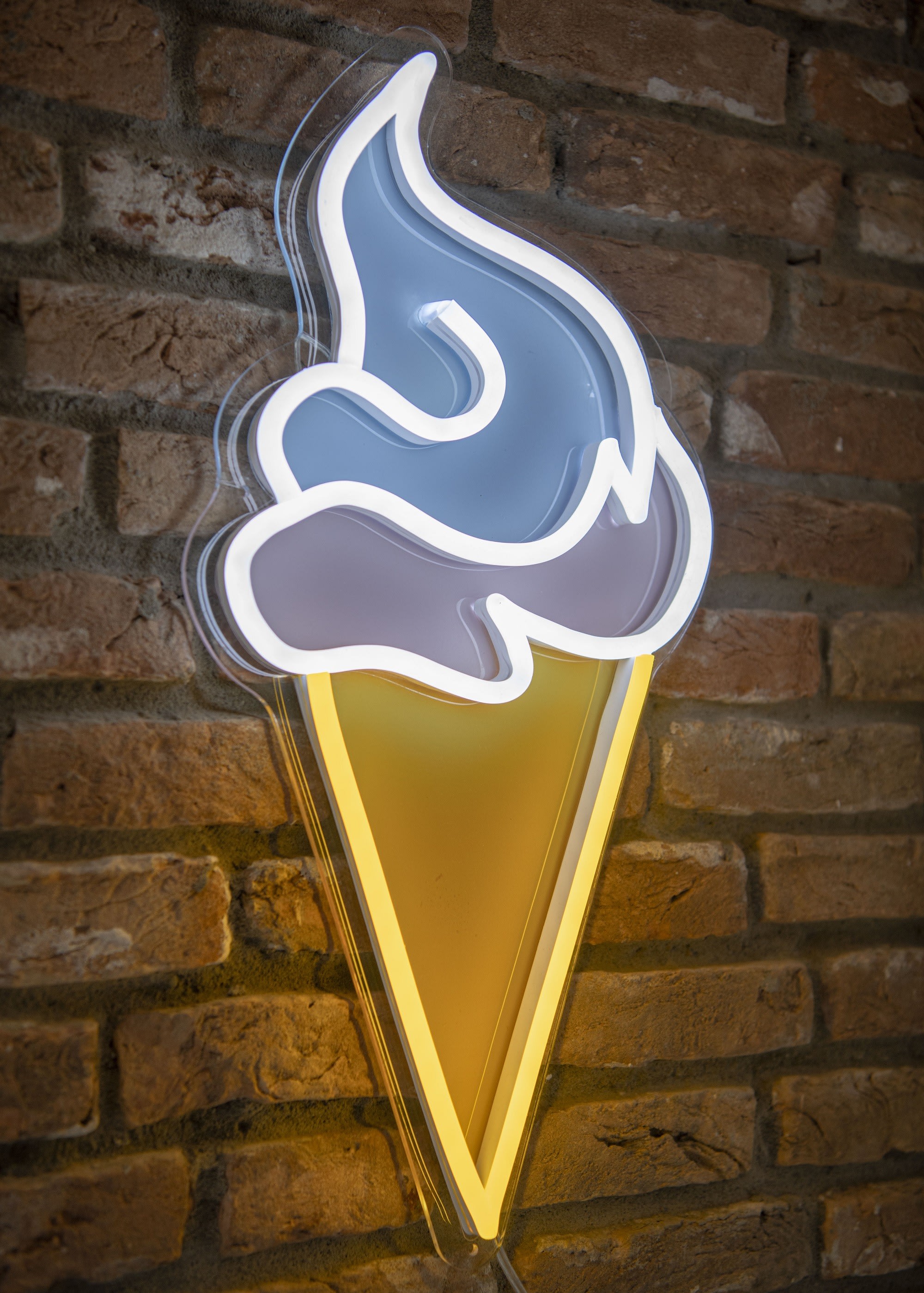 Les enseignes au néon Bailey LED se composent de bandes avec des éléments LED qui sont si étroitement liés qu'ils ressemblent à une ligne droite. Les bandes obtenues sont ensuite coulées dans du silicone et montées sur un panneau acrylique. Il a donc