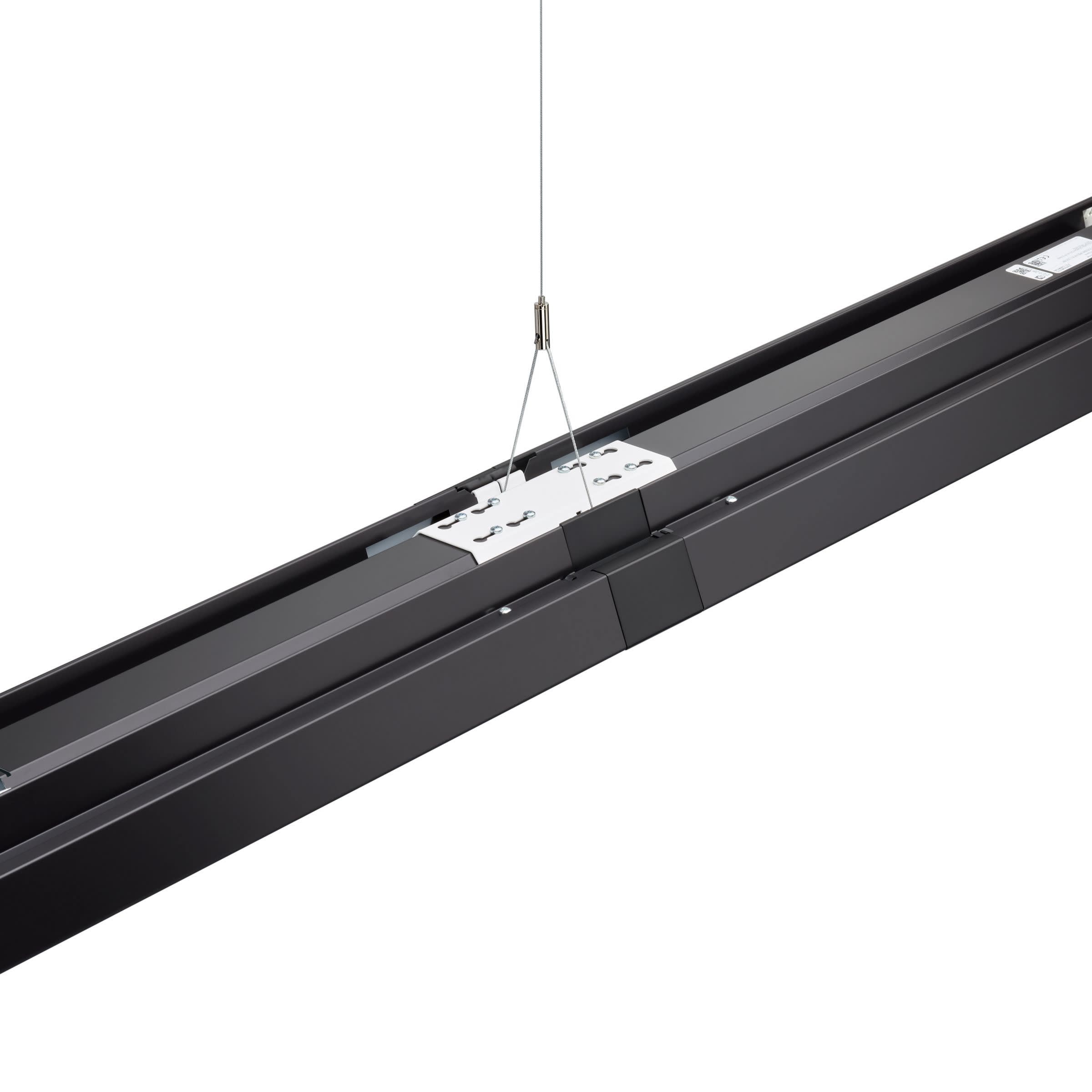1470x200 mm; H73 mm, Acier, Noir, Noir de sécurité (RAL9004), Jeu de suspension double, triangle, Bloc d'alimentation avec interface DALI, 4500 lm, 35 W, 129 lm/W, 4000 K, (0.43, 0.40) SDCM 3, CRI90, UGR19, Faisceau extensif, Texturé, Polycarbonate, IP20 | Protection des doigts, IK02 | 0,2 J standard, Classe électrique I, Connecteur à poussoir 5 pôles