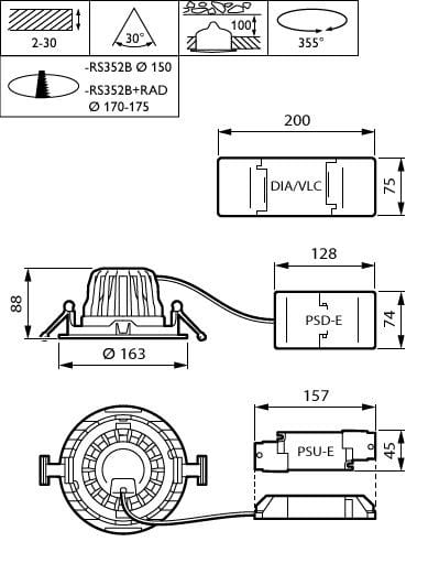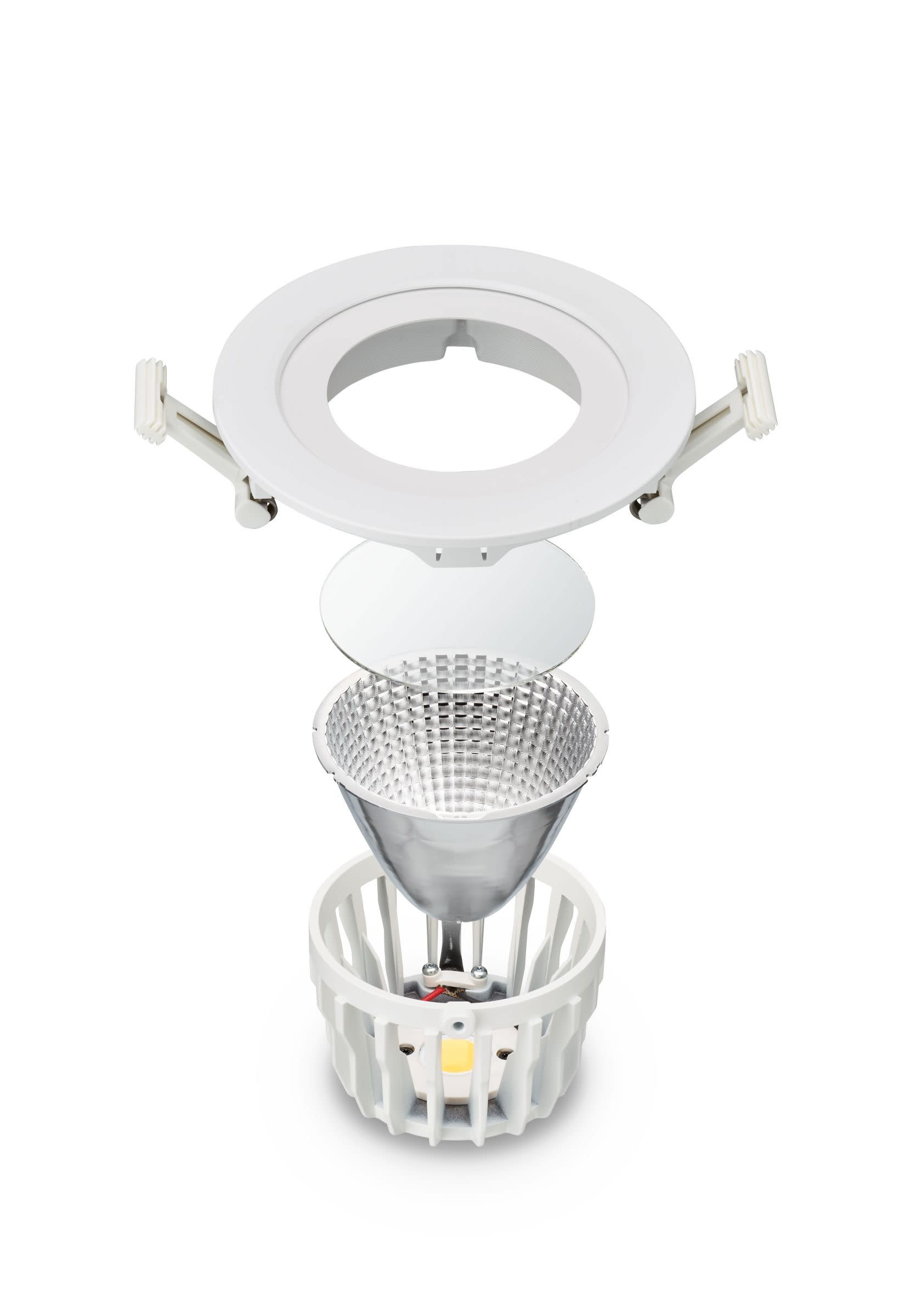 C/O D150 mm, Aluminium, Blanc, Poudrage simple couche, Bloc d'alimentation externe (Marche/Arrêt), 3100 lm, 22.5 W, 138 lm/W, 4000 K, (0.382, 0.380) SDCM 2, Faisceau extensif, Réflecteur PerfectAccent, IP20 | Protection des doigts, IK02 | 0,2 J standard, Classe de sécurité II, 2 connecteurs à poussoir 2 pôles, TP(a) diffuser flammability class