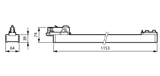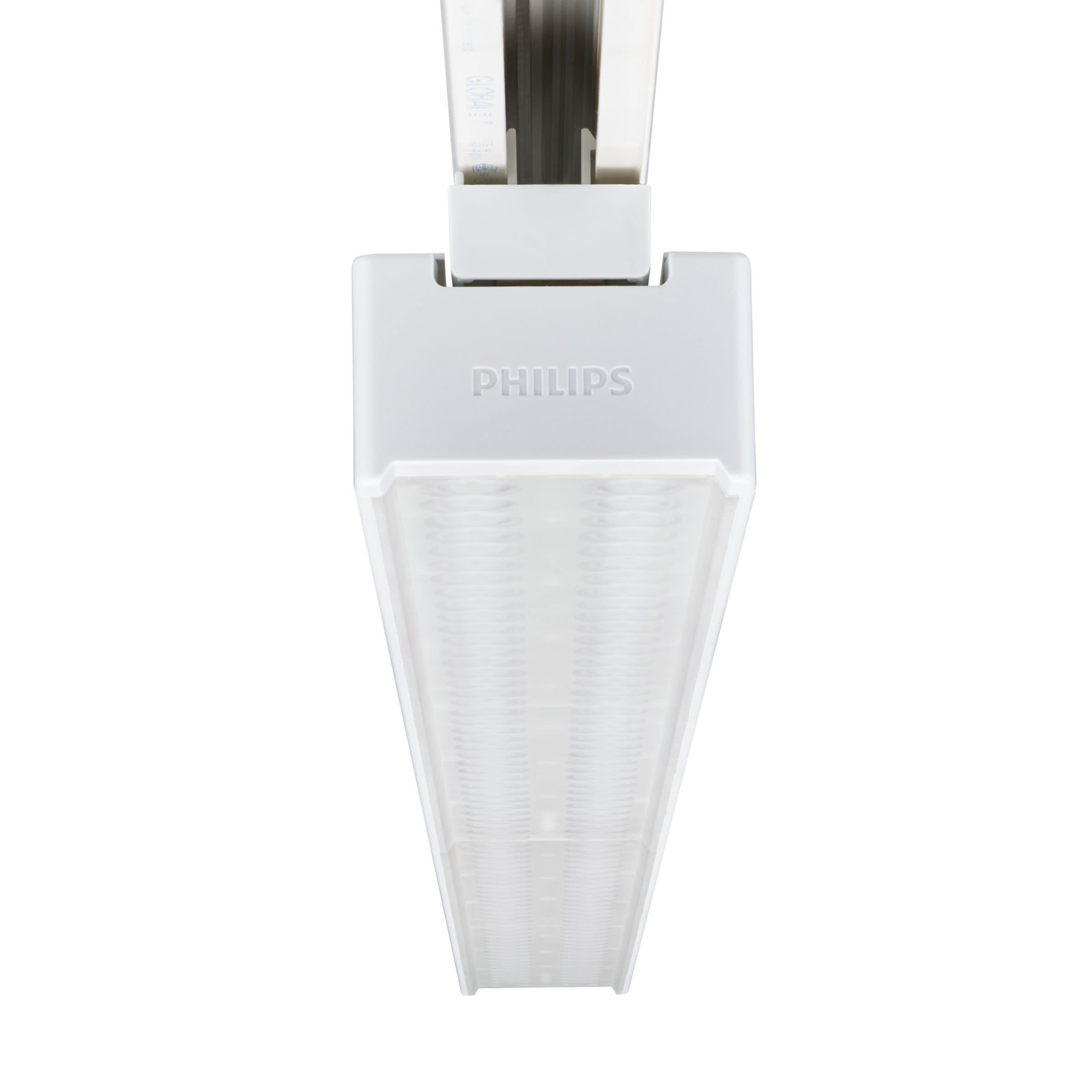 L1200 mm, Aluminium extrudé, Blanc, Bloc d’alimentation électrique (Marche/Arrêt), 6600 lm, 43 W, 153 lm/W, 4000 K, (0.38, 0.38) SDCM3, Optique asymétrique double 45°, Transparent, Polycarbonate, IP20 | Protection des doigts, IK02 | 0,2 J standard, Classe électrique I, Rail