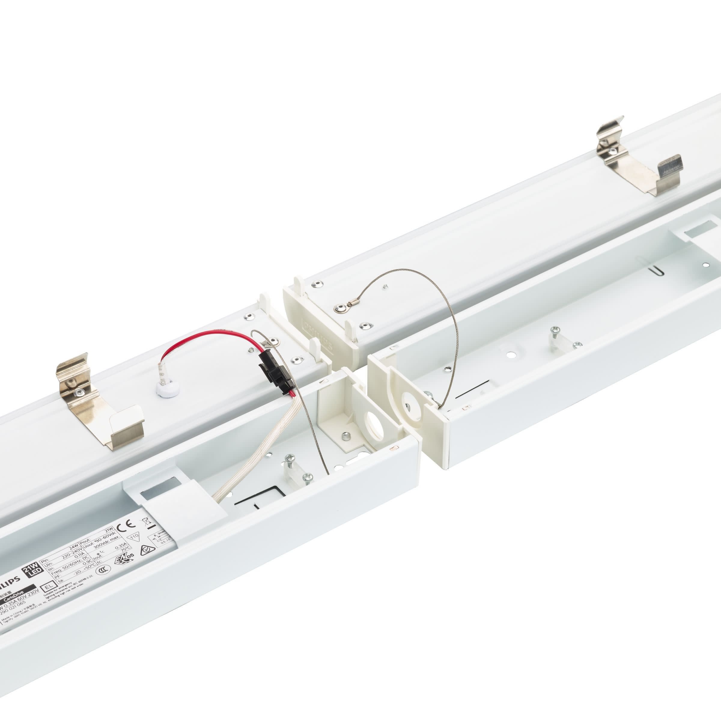 BATTEN, L1500, Métal-Plastique, Blanc RAL 9003, Bloc d’alimentation électrique (Marche/Arrêt), All-in, Multi Color Temperature, All-in, Multi Lumen, 3500 lm, 5200 lm, 37 W, 25 W, 140 lm/W, 3000 K, 4000 K, (0.43,0.40) SDCM≤3, Symétrique, Opale, Polycarbonate, IP20/40 | Protection des doigts ; protection des fils, IK04 | 0,5 J standard plus, Classe électrique I, Connecteur à poussoir 3 pôles, Connexion simple et cache amovible disponible pour le câblage de traversée monophasé (le câblage interne n'est pas inclus)