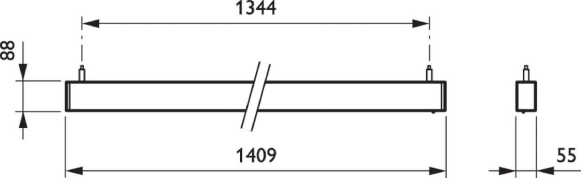 1410x55 mm; H88 mm, Aluminium, Aluminium, Bloc d'alimentation avec interface DALI, 7700 lm, 60 W, 128 lm/W, 3000 K, (0.38, 0.38) SDCM 3, CRI90, UGR16, Faisceau extensif, Dépoli, Polyméthacrylate de méthyle, IP20 | Protection des doigts, IK03 | 0,35 J renforcé, Classe électrique I, Connecteur à poussoir 5 pôles