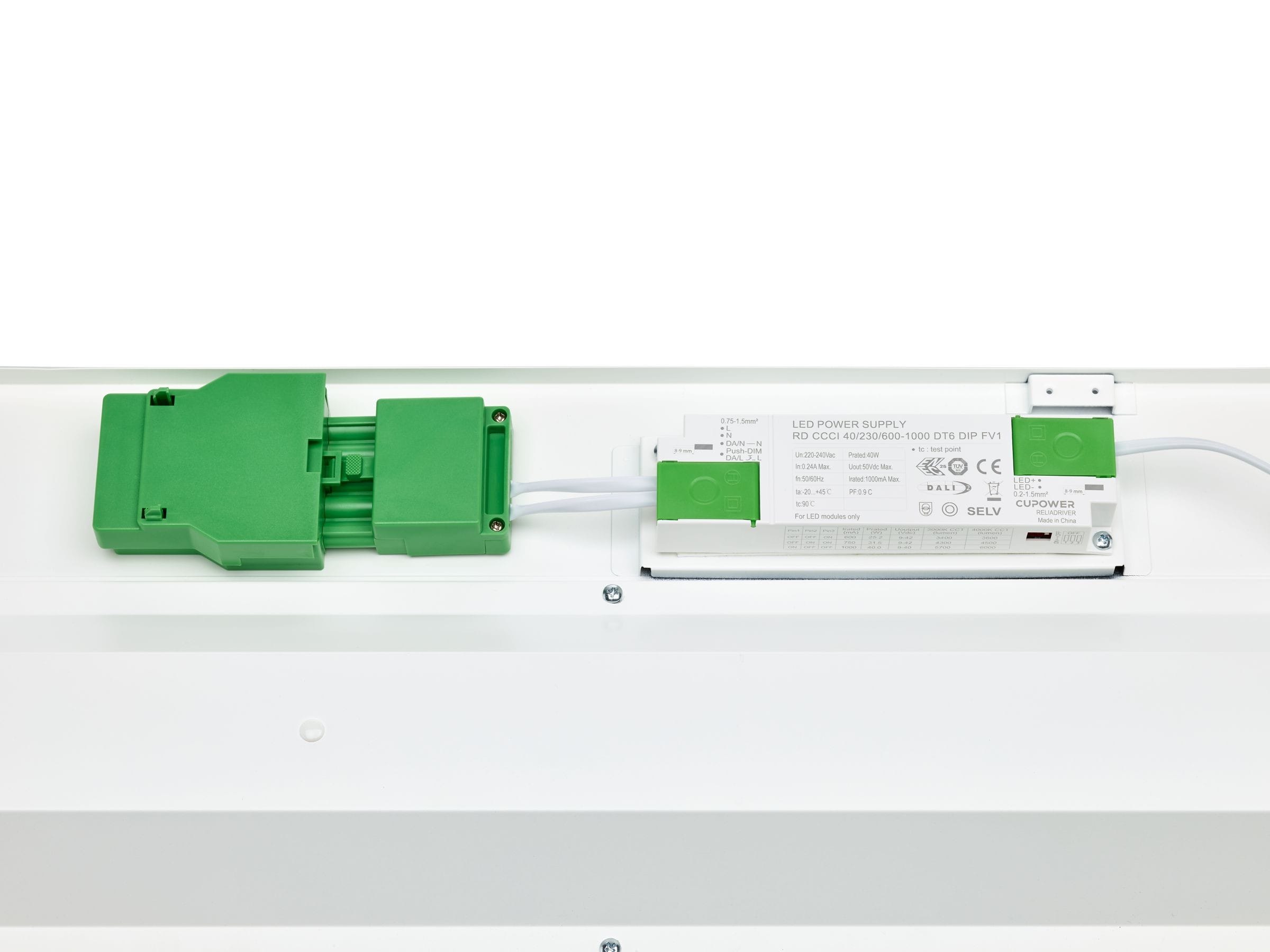 200x1200 mm, Acier, Blanc, Blanc de sécurité (RAL9003), Plafonnier, Bloc d'alimentation avec interface DALI, All-in, Multi Lumen, 3600 lm, 4500 lm, 6000 lm, 38.5 W, 23 W, 157 lm/W, 155 lm/W, 4000 K, (0.38.0.38)SDCM3, UGR19, Conformité aux normes d’éclairage de bureau à faisceau extensif, Lentille microprismatique, Polycarbonate, IP20/44 | Protection des doigts, protection des fils, protection contre les éclaboussures, IK03 | 0,35 J renforcé, Classe de sécurité II, Câble sans prise 5 pôles, Connecteur à poussoir 5 pôles