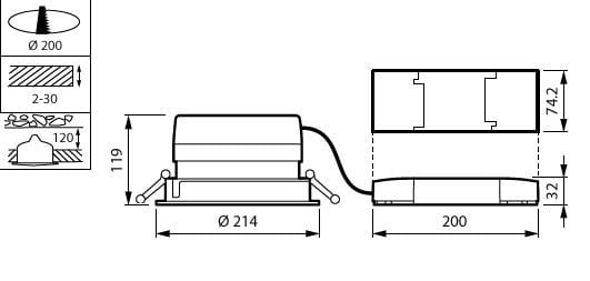 D200 mm, Plastique, Blanc, Bloc d'alimentation externe (Marche/Arrêt), 5900 lm, 37 W, 159 lm/W, 4000 K, (0.38,0.38), Réflecteur brillant, ?IP20 | Protection des doigts, IK02 | 0,2 J standard, Classe de sécurité II