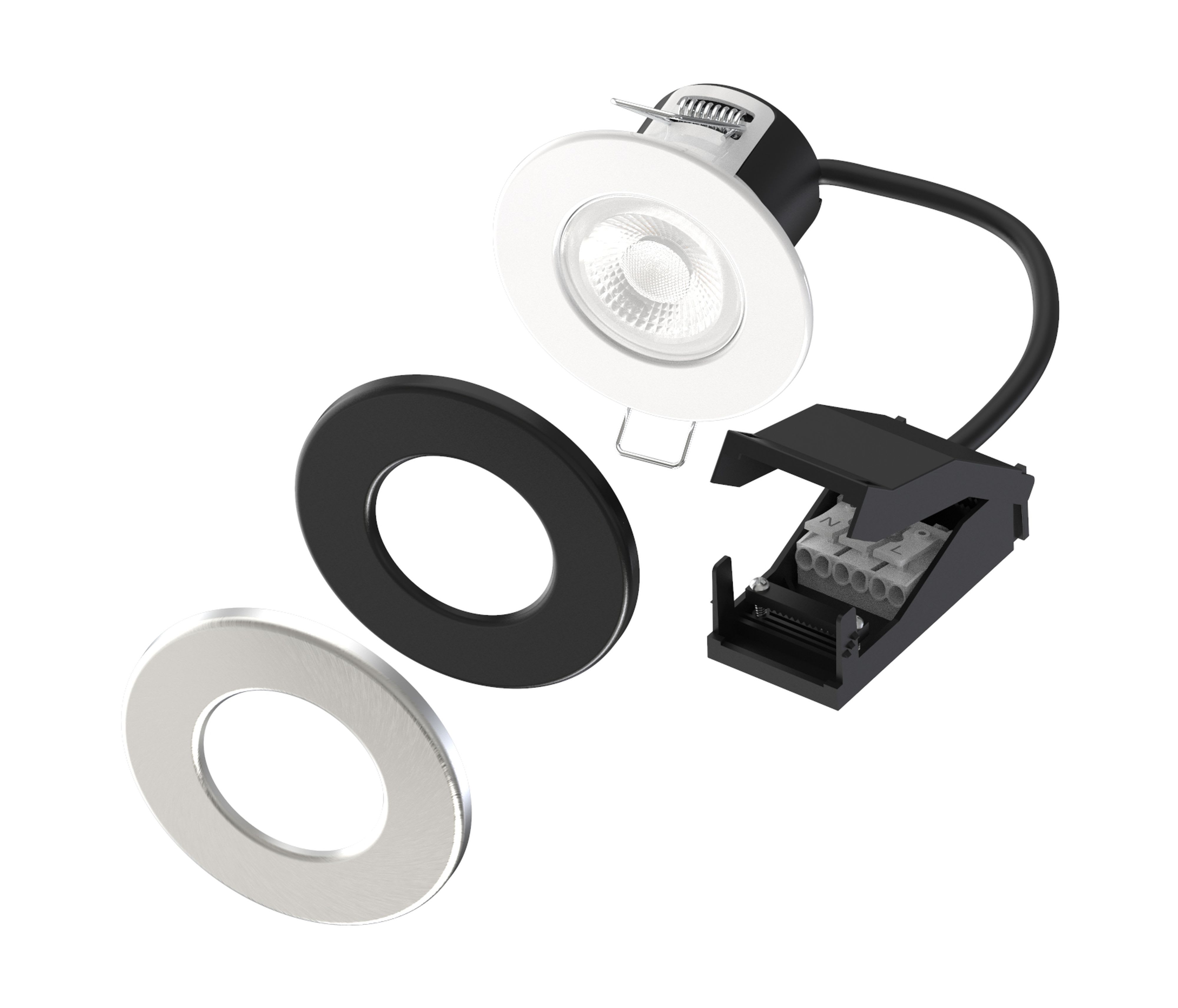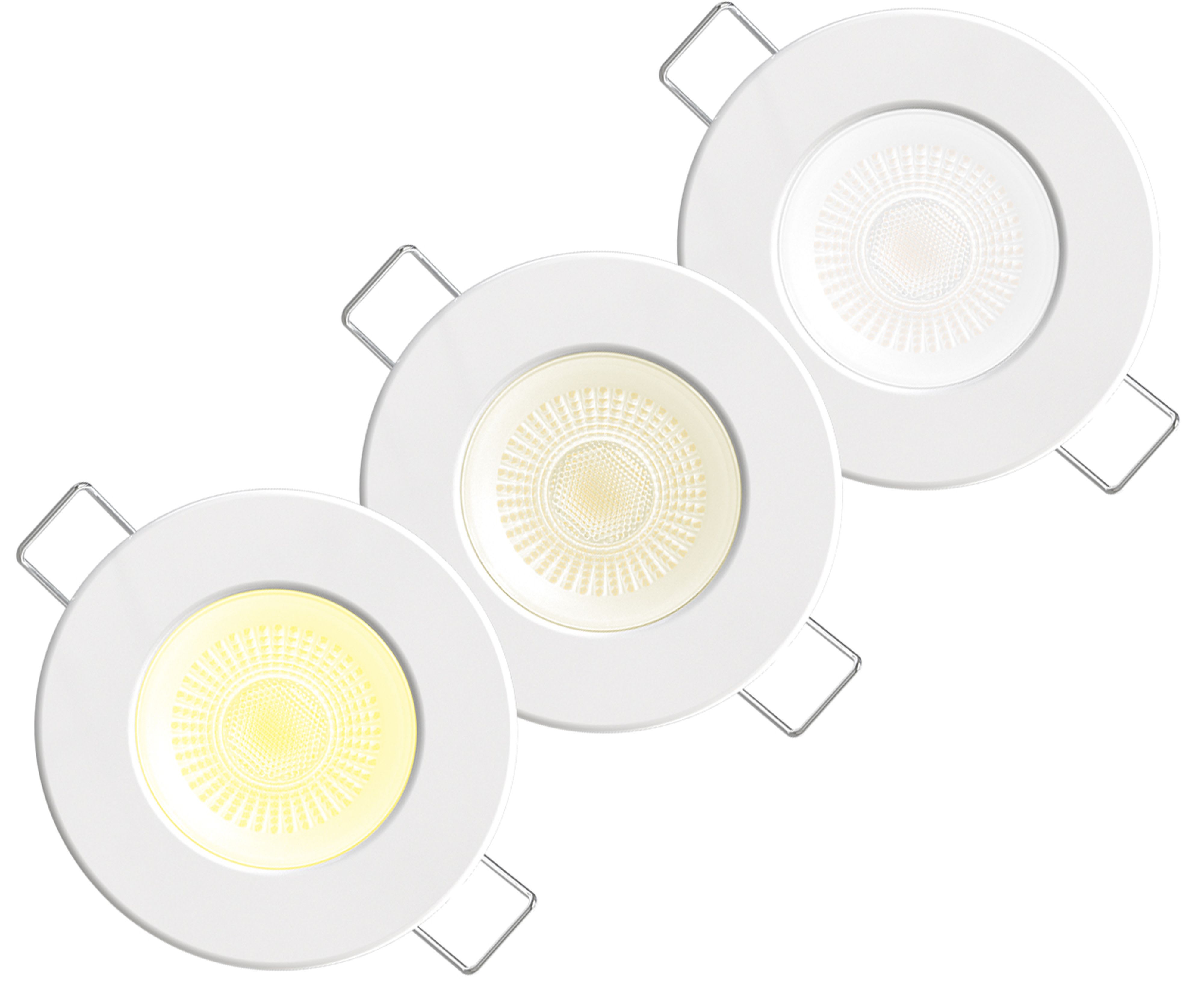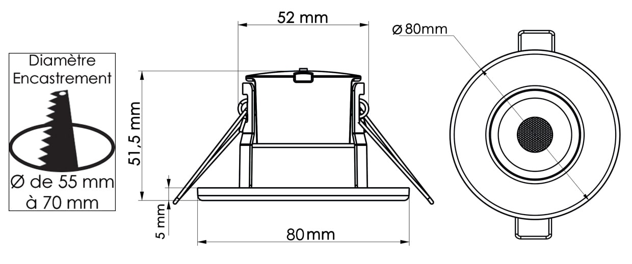 encastre 6W RT2012/IP65/IK04/BBC/RE2020/3 couleurs de températures 3000°k/4000°k/6000°k,100%dimmable,encastrement diam 55mm à 70mm, faisceau 60° finition blanc mat + 2 collerettes alu brossé/noir mat incluses