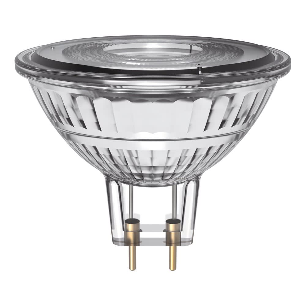 Lampes LED à réflecteur MR16, très basse tension, gradables, culot à broches. Caractéristiques du produit: Alternative LED aux lampes halogènes basse tension. Grande homogénéité de couleur : ≤ sdcm. Gradable. Culot : GU5.3. Lampe en verre. Rendu des couleurs très élevé (Ra : 90). Durée de vie : jusqu'à 25 000 h. Avantages du produit: Remplacement rapide, simple et sûr sans recâblage. Conception, dimensions, flux lumineux comparables à une lampe à incandescence classique ou halogène. Faibles coûts de maintenance grâce à une longue durée de vie. Pas d'émission d'UV ni d'IR dans le faisceau lumineux. Gradation en continu. Compatible avec de nombreux variateurs, voir www.ledvance.fr/dim. Compatible avec de nombreuses alimentations électroniques et conventionnelles standard (voir aussi liste de compatibilité). Allumage instantané. Consommation d'énergie inférieure à celle des lampes à incandescence ou halogènes. Zones d'application: Commerces et salles d'exposition. Applications domestiques. Applications commerciales. Éclairage d'accentuation. Utilisation en extérieur uniquement dans des luminaires d'extérieur appropriés. Conseils de sécurité: Ne touchez pas la lampe si elle est cassée.. Ne doit pas être utilisé si l'ampoule extérieure est défectueuse..