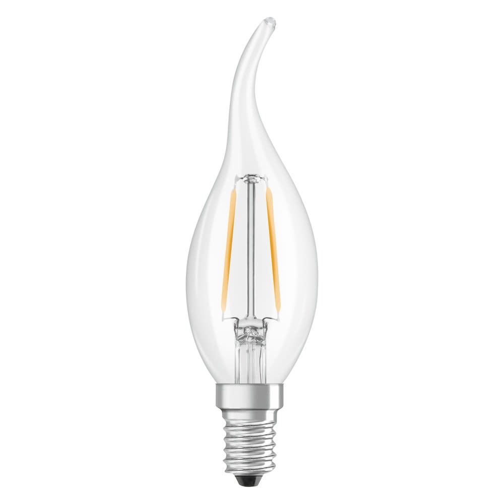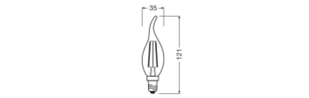 Lampes LED, forme classique de mini-bougie avec pointe incurvée. Caractéristiques du produit: Lampes LED professionnelles pour tension secteur. Non gradable. Ouverture du faisceau : jusqu'à 300°. Lampe en verre. Bonne qualité de la lumière ; indice de rendu des couleurs Ra: ≥ 80; chromaticité constante. Avantages du produit: Lampes avec technologie de « filament » LED innovante. Consommation d'énergie inférieure à celle des lampes à incandescence ou halogènes. Pas d'émission d'UV ni d'IR dans le faisceau lumineux. Allumage instantané. Peut remplacer facilement les lampes standard. Puissance thermique plus faible (par rapport au produit de référence standard). Zones d'application: Idéal pour les installations décoratives. Applications domestiques. Éclairage général. Utilisation en extérieur uniquement dans des luminaires d'extérieur appropriés. Conseils de sécurité: Ne touchez pas la lampe si elle est cassée.. Ne doit pas être utilisé si l'ampoule extérieure est défectueuse..