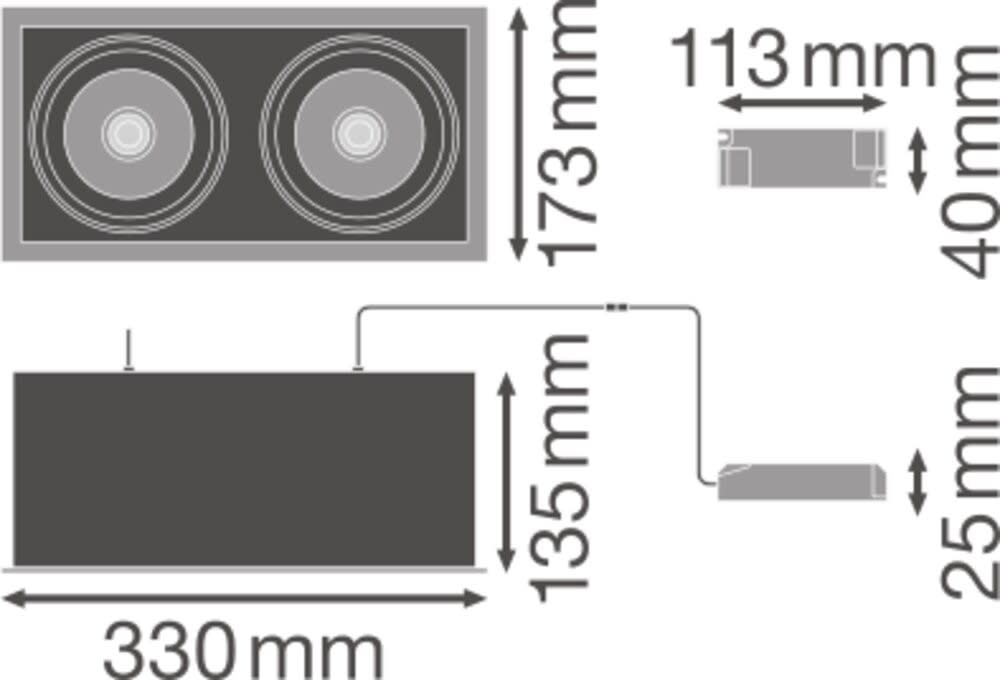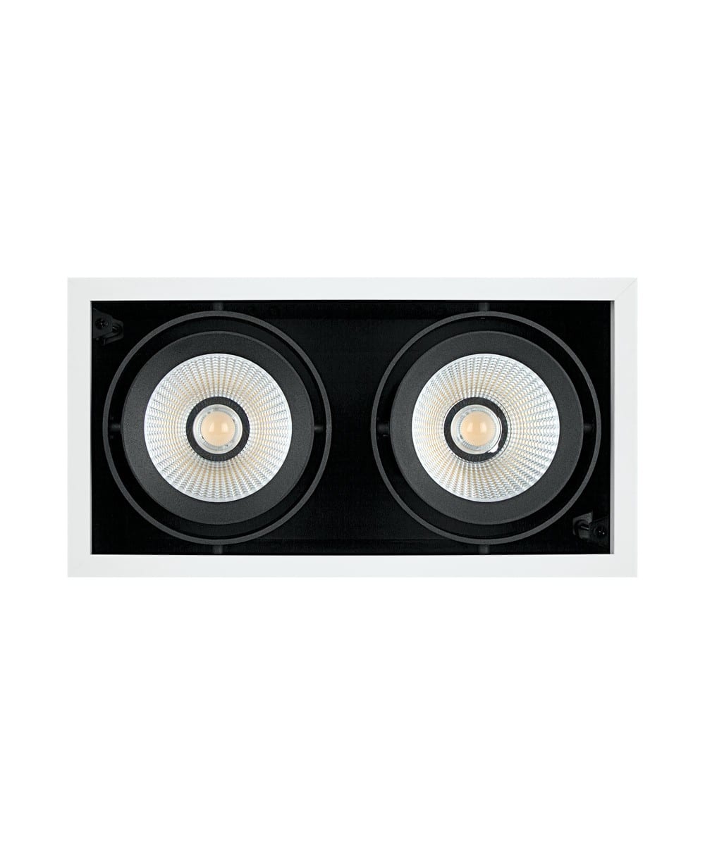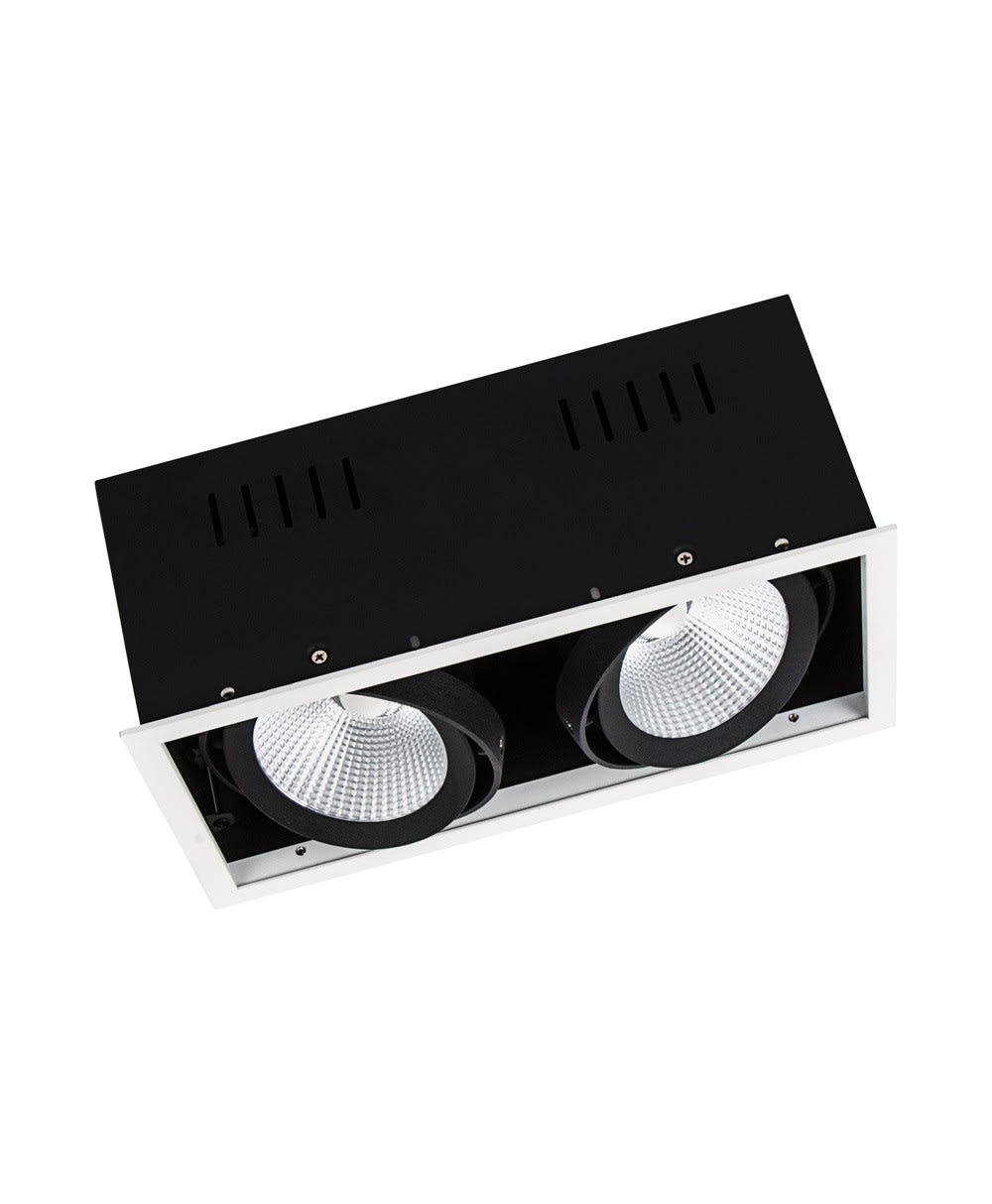 Spot encastré, pivotant, comprenant deux spots. Caractéristiques du produit: Grand réflecteur à facettes pour haute puissance lumineuse. Angle de faisceau : 38°. Angle de réglage du support : +/- 25 °. Avantages du produit: Faible scintillement grâce à un ballast électronique spécial. Efficacité lumineuse élevée. Convient à d’autres installations au plafond grâce au corps fermé en tôle d’acier. Remplacement simple du convertisseur externe. Design fonctionnel et épuré. Garantie de 5 ans. Zones d'application: Éclairage de balisage et éclairage général pour tous types d’espaces de vente. Fashion shops, accessories shops. Magasins, boutiques. Chambres d'hôtel. Cafés. Technique / Accessoires: Système de pilotage inclus. Conseils de sécurité: Tous les branchements électriques doivent être effectués par une personne qualifiée.. Attention, risque de choc électrique.. Les luminaires ne conviennent pas pour être recouverts de matériaux à isolation thermique..