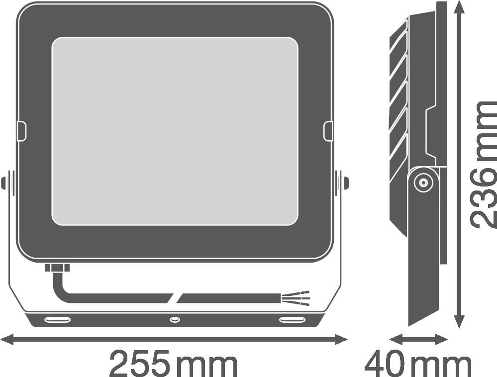 Projecteur avec un flux lumineux allant jusqu'à 9000 lm. Caractéristiques du produit: Distribution symétrique de la lumière basée sur un réflecteur avec un angle de faisceau de 100° x 100°. Protection contre les surtensions : jusqu'à 4 kV (L / N-PE), 2 kV (L-N). Support de montage avec angle de 30° et large zone de rotation. Câble flexible préinstallé de 1 m (H05RN-F), 3 fils de 1,0 mm² enroulés. Membrane pour optimiser l'échange d'air, sans compromettre la protection IP. Avantages du produit: Robuste, mais léger et design compact. Éclairage uniforme et de qualité, grâce au diffuseur dépoli en verre trempé. Aucun flux lumineux au dessus de la ligne d'horizon (ULR 0%) lorsqu'il est monté à 0° d'inclinaison. Économies d’énergie pouvant atteindre 90% par rapport aux projecteurs de lampe halogène. Garantie de 3 ans. Zones d'application: Remplace les projecteurs halogènes. Utilisation en extérieur (IP65). Espaces publiques. Façades de bâtiments. Jardins, balcons et autres espaces extérieurs. Zones de construction. Conseils de sécurité: Surface de prise au vent maximum 0,043 m². Le câble ou cordon flexible externe de ce luminaire ne peut pas être remplacé ; si le cordon est endommagé, le luminaire doit être détruit.. Bornier non inclus. L'installation doit être effectuée par une personne qualifiée.. Attention, risque de choc électrique.. Produit de classe de protection I. Toutes les pièces métalliques conductrices d'électricité du boîtier qui peuvent absorber une tension pendant le fonctionnement ou pendant la maintenance en cas de défaut doivent être reliées en permanence au conducteur de protection..