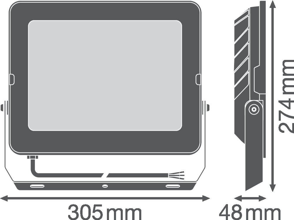 Projecteur avec un flux lumineux allant jusqu'à 13500 lm. Caractéristiques du produit: Distribution symétrique de la lumière basée sur un réflecteur avec un angle de faisceau de 100° x 100°. Protection contre les surtensions : jusqu'à 4 kV (L / N-PE), 2 kV (L-N). Support de montage avec angle de 30° et large zone de rotation. Câble flexible préinstallé de 1 m (H05RN-F), 3 fils de 1,0 mm² enroulés. Membrane pour optimiser l'échange d'air, sans compromettre la protection IP. Avantages du produit: Robuste, mais léger et design compact. Éclairage uniforme et de qualité, grâce au diffuseur dépoli en verre trempé. Aucun flux lumineux au dessus de la ligne d'horizon (ULR 0%) lorsqu'il est monté à 0° d'inclinaison. Économies d’énergie pouvant atteindre 90% par rapport aux projecteurs de lampe halogène. Garantie de 3 ans. Zones d'application: Remplace les projecteurs halogènes. Utilisation en extérieur (IP65). Espaces publiques. Façades de bâtiments. Jardins, balcons et autres espaces extérieurs. Zones de construction. Conseils de sécurité: Surface max. de prise au vent 0,061 m². Le câble ou cordon flexible externe de ce luminaire ne peut pas être remplacé ; si le cordon est endommagé, le luminaire doit être détruit.. Bornier non inclus. L'installation doit être effectuée par une personne qualifiée.. Attention, risque de choc électrique.. Produit de classe de protection I. Toutes les pièces métalliques conductrices d'électricité du boîtier qui peuvent absorber une tension pendant le fonctionnement ou pendant la maintenance en cas de défaut doivent être reliées en permanence au conducteur de protection..