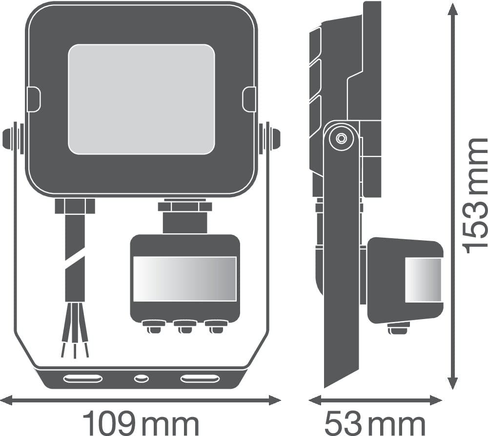 Floodlight Sensor avec un flux lumineux allant jusqu'à 1000 lm. Caractéristiques du produit: Détecteur de mouvement et de lumière du jour orientable. Détecteur avec rotation 350° et inclinaison à 180°. Distribution symétrique de la lumière basée sur un réflecteur avec un angle de faisceau de 100° x 100°. Support de montage avec angle de 30° et large zone de rotation. Câble flexible préinstallé de 1 m (H05RN-F), 3 fils de 1,0 mm² enroulés. Avantages du produit: Robuste, mais léger et design compact. Eclairage optimisé grâce à un détecteur flexible et programmable. Réglage facile de la portée du détecteur, de la détection de la lumière du jour et de la temporisation. Mode allumage permanent, activé via un schéma de commutation secteur spécial. Éclairage uniforme et de qualité, grâce au diffuseur dépoli en verre trempé. Aucun flux lumineux au dessus de la ligne d'horizon (ULR 0%) lorsqu'il est monté à 0° d'inclinaison. Économies d’énergie pouvant atteindre 90% par rapport aux projecteurs de lampe halogène. Garantie de 3 ans. Zones d'application: Remplace les projecteurs halogènes. Utilisation en extérieur (IP65). Espaces publiques. Façades de bâtiments. Jardins, balcons et autres espaces extérieurs. Zones de construction. Conseils de sécurité: Le câble ou cordon flexible externe de ce luminaire ne peut pas être remplacé ; si le cordon est endommagé, le luminaire doit être détruit.. Bornier non inclus. L'installation doit être effectuée par une personne qualifiée.. Attention, risque de choc électrique.. Produit de classe de protection I. Toutes les pièces métalliques conductrices d'électricité du boîtier qui peuvent absorber une tension pendant le fonctionnement ou pendant la maintenance en cas de défaut doivent être reliées en permanence au conducteur de protection..