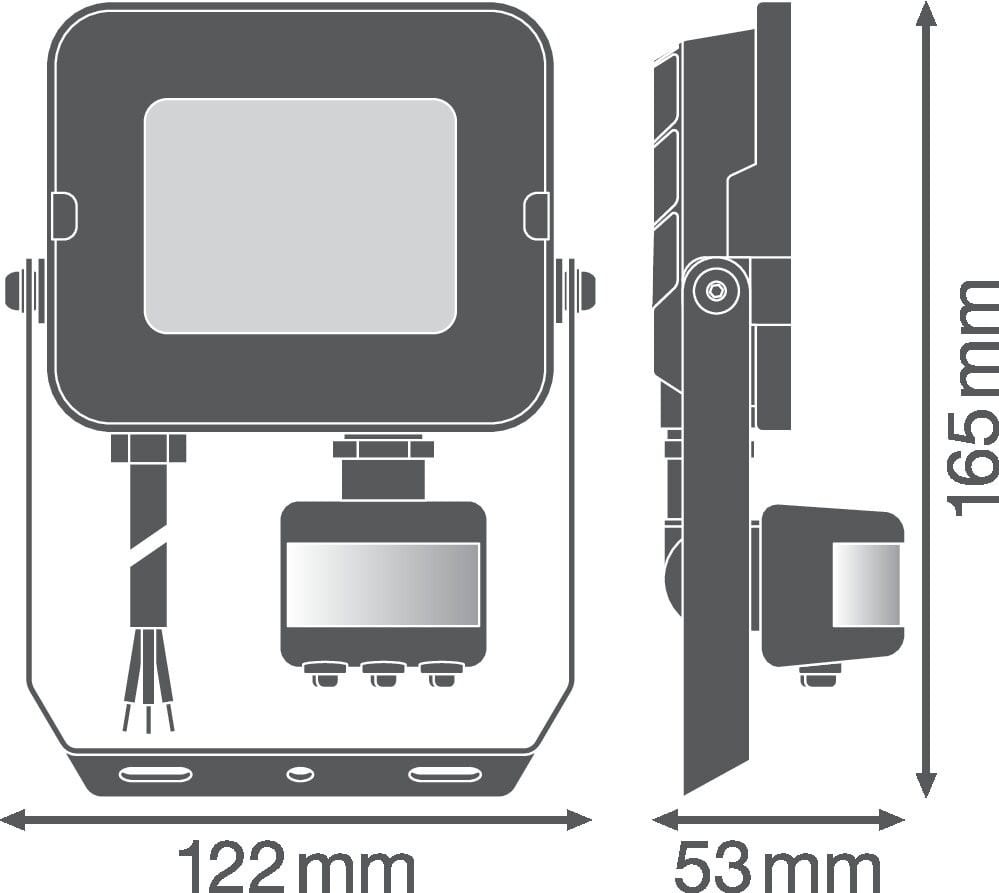 Floodlight Sensor avec un flux lumineux allant jusqu'à 2000 lm. Caractéristiques du produit: Détecteur de mouvement et de lumière du jour orientable. Détecteur avec rotation 350° et inclinaison à 180°. Distribution symétrique de la lumière basée sur un réflecteur avec un angle de faisceau de 100° x 100°. Support de montage avec angle de 30° et large zone de rotation. Câble flexible préinstallé de 1 m (H05RN-F), 3 fils de 1,0 mm² enroulés. Avantages du produit: Robuste, mais léger et design compact. Eclairage optimisé grâce à un détecteur flexible et programmable. Réglage facile de la portée du détecteur, de la détection de la lumière du jour et de la temporisation. Mode allumage permanent, activé via un schéma de commutation secteur spécial. Éclairage uniforme et de qualité, grâce au diffuseur dépoli en verre trempé. Aucun flux lumineux au dessus de la ligne d'horizon (ULR 0%) lorsqu'il est monté à 0° d'inclinaison. Économies d’énergie pouvant atteindre 90% par rapport aux projecteurs de lampe halogène. Garantie de 3 ans. Zones d'application: Remplace les projecteurs halogènes. Utilisation en extérieur (IP65). Espaces publiques. Façades de bâtiments. Jardins, balcons et autres espaces extérieurs. Zones de construction. Conseils de sécurité: Le câble ou cordon flexible externe de ce luminaire ne peut pas être remplacé ; si le cordon est endommagé, le luminaire doit être détruit.. Bornier non inclus. L'installation doit être effectuée par une personne qualifiée.. Attention, risque de choc électrique.. Produit de classe de protection I. Toutes les pièces métalliques conductrices d'électricité du boîtier qui peuvent absorber une tension pendant le fonctionnement ou pendant la maintenance en cas de défaut doivent être reliées en permanence au conducteur de protection..