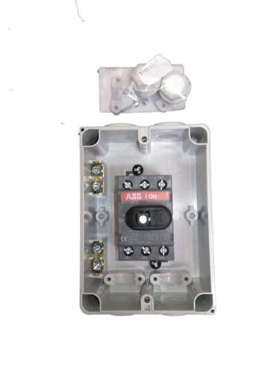 Le boîtier de la série OTP utilise un boîtier rigide en polycarbonate renforcé de verre. Le boîtier est protégé contre les UV, protégé contre les jets d'eau à basse pression (IP65), et donc conçu pour une utilisation en extérieur et en intérieur. Les entrées de câbles sont filetées et ont des trous à défoncer pour 2 câbles parallèles, à la fois du haut et du bas. La poignée est cadenassable et conçue pour trois cadenas. Le couvercle est verrouillé. L'interverrouillage peut être contourné, pour la thermographie, etc. L'interrupteur est conçu pour un système à 5 fils et possède une borne neutre fixe et une borne PE. Deux presse-étoupes et deux bouchons de traction inclus.