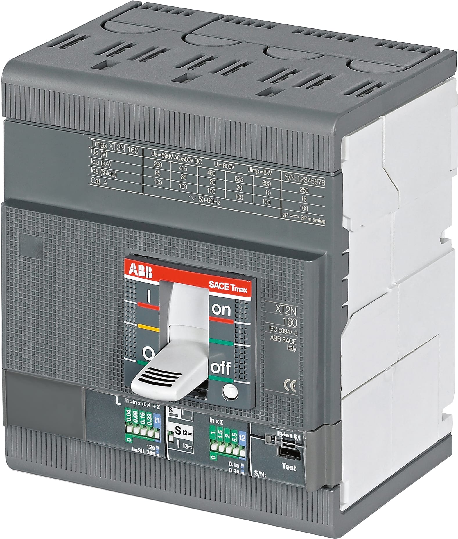 Disjoncteurs à boîtier moulé TMAX XT2S 160 fixe à quatre pôles avec bornes avant et décharge à état solide dans AC EKIP-LS/I R 160 A neutre totalement nominal
