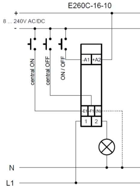 Les télérupteurs électroniques avec une tension de commande universelle de 8 à 240 V AC/DC garantissent un maximum de fiabilité, de durée de vie et un fonctionnement silencieux. La version E260C dispose d'une fonction de commande centrale intégrée (ON/OFF), qui est également réglable sur les versions E260CA.