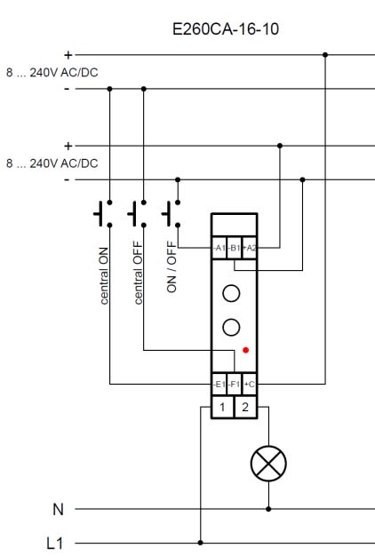 Les télérupteurs électroniques avec une tension de commande universelle de 8 à 240 V AC/DC garantissent un maximum de fiabilité, de durée de vie et un fonctionnement silencieux. La version E260C dispose d'une fonction de commande centrale intégrée (ON/OFF), qui est également réglable sur les versions E260CA.