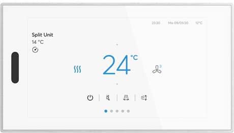 Écran tactile multifonction HD IPS KNX en tant qu'élément de commande d'ambiance pour la visualisation et le contrôle de toutes les fonctions d'un système KNX. Pour l'affichage et la commande intuitive des fonctions KNX standard suivantes: commutation, interrupteur à bascule, variation (4 bits et 8 bits), curseur, store, élément de commande RGBW, élément de contrôle de température ambiante, élément de commande Split Unit, interrupteur à pas, commutateur de scène, élément d'affichage ou élément de contrôle audio. Fonctions supplémentaires: 20 messages d'erreur et d'alarme, 10 fonctions logiques, 10 minuteries avec chacune 6 heures de commutation, 4 actionneurs de scène, 1 régulateur de température ambiante et des pages individuelles peuvent être protégées par un code PIN. Affichage de l'état, affichage de la date et de l'heure, ainsi que de la température intérieure et extérieure. Capteur de température installé, capteur de proximité et capteur de luminosité. Avec une entrée de bouton-poussoir / interrupteur et une entrée de capteur de température externe. Affichage de page avec un maximum de 30 surfaces tactiles sur 6 ou 10 pages (selon la méthode de montage). Affichage de l'angle de vision: 160 ° - 160 °. Montage via un boîtier encastré séparé. Alimentation externe: 20-32 VDC (SELV).