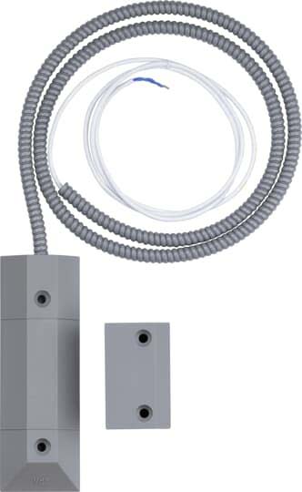 Le contact Reed pour portes roulantes se monte principalement sur les portes roulantes, coulissantes et basculantes. Le boîtier de contact est monté au sol (une surface d'appui plane est nécessaire). Seules les vis en matériau antimagnétique peuvent être utilisées pour le montage. Grâce à la conception résistante aux intempéries et mécaniquement stable du boîtier de contact, le circuit est largement protégé contre les dommages lorsque des véhicules à pneus en caoutchouc roulent dessus. Le câble à 4 fils est protégé par un tuyau métallique plastifié.