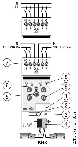 L'appareil détecte quatre signaux 10 ... 230V AC / DC. Etat des entrées via 4 LED. Max. 4 signaux (en 2 groupes) sont détectables. Chaque canal un bouton poussoir pour le fonctionnement manuel. Fourni par ABB i-bus®.