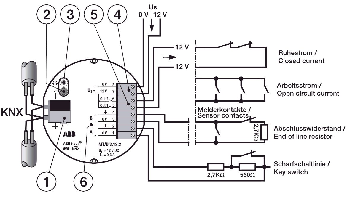 utilisé pour la connexion surveillée de capteurs de la technologie de sécurité (par exemple, contacts magnétiques ou capteurs de bris de verre) à l'ABB i-bus® KNX. L'appareil dispose de deux entrées ( zones ») et peut être utilisé comme système de sécurité autonome ou en combinaison avec le module de sécurité ou la centrale d'alarme anti-intrusion avec interface KNX. Alimentation 12 V CC SELV requise, par ex. NTU/S 12.2000.1. Les applications typiques sont la surveillance de portes et fenêtres, la détection de bris de glace ainsi que la surveillance de zones.