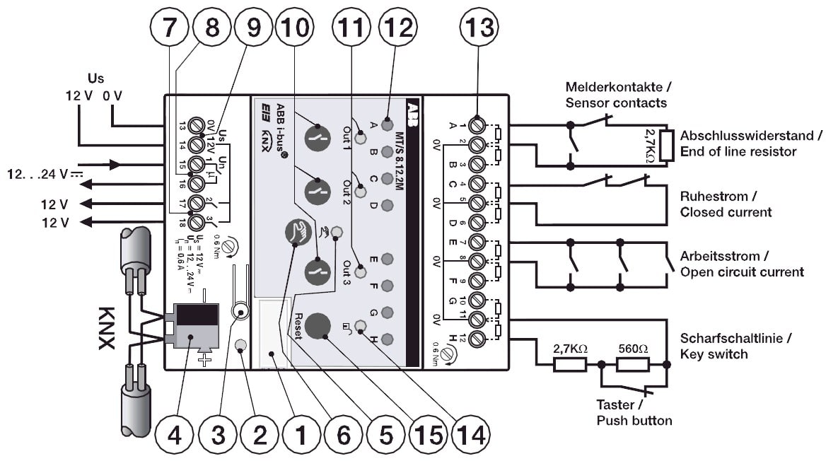 utilisé pour la connexion surveillée de capteurs de la technologie de sécurité (par exemple, contacts magnétiques ou capteurs de bris de verre) à l'ABB i-bus® KNX. L'appareil dispose de huit entrées ( zones ») disponibles et peut être utilisé comme système de sécurité autonome ou en combinaison avec le module de sécurité ou la centrale d'alarme anti-intrusion avec interface KNX. Alimentation 12 V CC SELV requise, par ex. NTU/S 12.2000.1. Les applications typiques sont la surveillance de portes et fenêtres, la détection de bris de glace ainsi que la surveillance de zones.