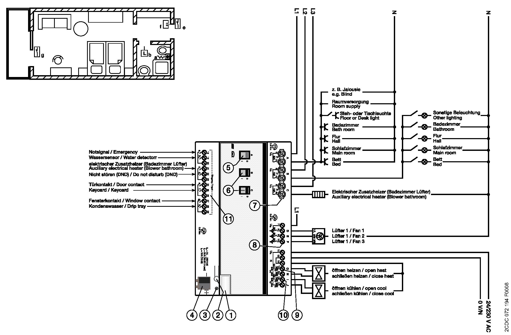 Dispositif de contrôle des gammes d'appartements avec bain, généralement dans les hôtels et les petits appartements. 8 entrées (binaires), 3 sorties (relais), 3 sorties de ventilateur et 2x2 sorties électroniques pour commandes de vannes. L'appareil est préconfiguré. Seul le fichier VD3 ou supérieur existe.