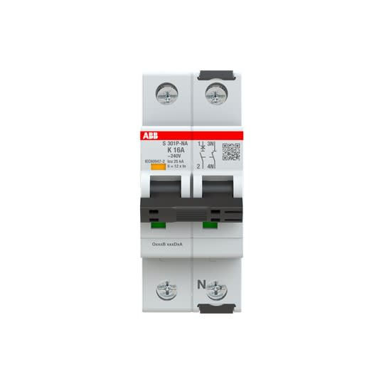 ABB - S300P-Disjoncteur 1P+NAD-16A-Courbe K-Pdc 25000A-230VAC 25kA-60VDC 25kA-1 module - A907933