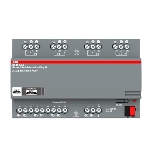 Appareil combiné avec 8 entrées binaires et 8 actionneurs de commutation. Des boutons-poussoirs ou des contacts auxiliaires conventionnels peuvent être connectés à 8 canaux. Les informations de la demande de contact peuvent être utilisées pour activer les actionneurs ABB-free @ home® ou pour enregistrer des informations d'état.La tension d'interrogation des contacts est rendue disponible par l'appareil lui-même.