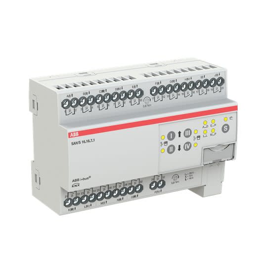L'actionneur de commutation combiné compact 16 A dispose de 16 relais de commutation indépendants. Les sorties peuvent être utilisées individuellement via ABB i-bus® KNX pour la commutation de charges électriques ou par paires pour la commande de volets roulants ou d'entraînements de stores 230 V AC (pas de verrouillage électromécanique). L'appareil dispose d'une opération manuelle, qui peut également être désactivée. Grâce à la commande manuelle, les sorties peuvent être commandées manuellement et l'état de commutation ou de conduite est affiché. L'appareil est alimenté par KNX et ne nécessite aucune alimentation supplémentaire.