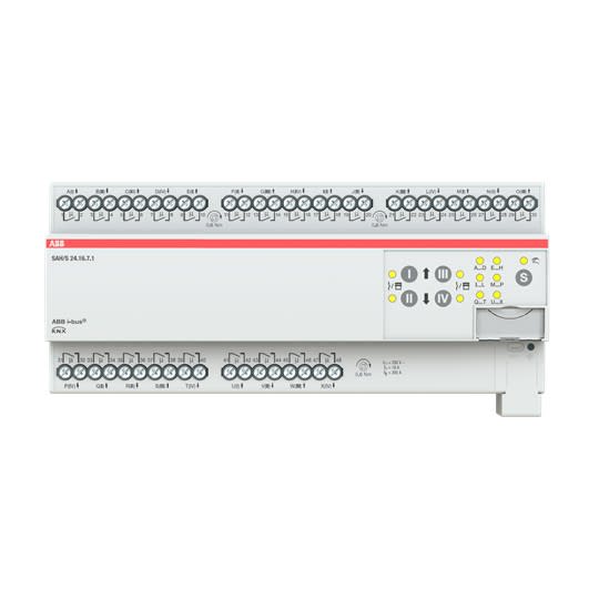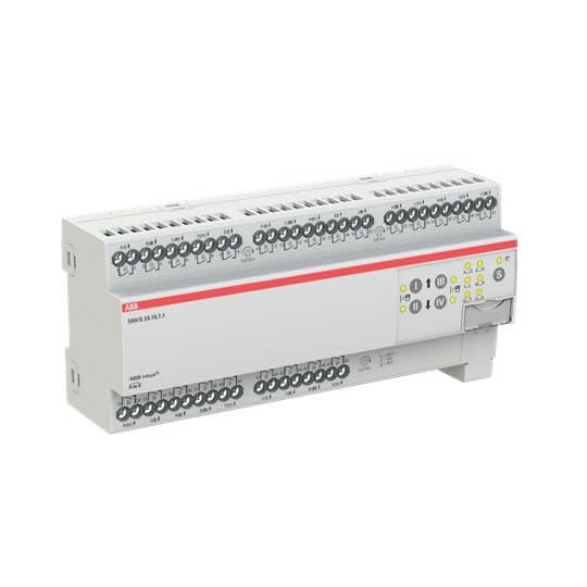 L'actionneur de commutation combiné compact 16 A dispose de 24 relais de commutation indépendants. Les sorties peuvent être utilisées individuellement via ABB i-bus® KNX pour la commutation de charges électriques ou par paires pour la commande de volets roulants ou d'entraînements de stores 230 V AC (pas de verrouillage électromécanique). L'appareil dispose d'une opération manuelle, qui peut également être désactivée. Grâce à la commande manuelle, les sorties peuvent être commandées manuellement et l'état de commutation ou de conduite est affiché. L'appareil est alimenté par KNX et ne nécessite aucune alimentation supplémentaire.