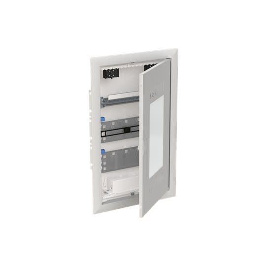 Coffret encastré de distribution en version multimédia – 2 à 5 rangées – Série UK600 – IP30 - Couleur blanche RAL 9016 – conforme à la norme DIN 43871 pour réaliser des tableaux de communication encastrés pour les logements résidentiels – résistant aux chocs (IK07) – Le coffret est en matière plastique résistant à la torsion, incassable, difficilement inflammable, faiblement halogénée, équipé d’un rail DIN amovible dans la rangée supérieure, d’un panneau de brassage isolé pouvant accueillir 12 connecteurs RJ45, d’une plaque de montage perforée modulaire pour le montage des appareillages, d’un porte-appareils média en caoutchouc pour un montage sans outil, de triple prises de courant orientables, de bracelets guide de filerie, de crampons muraux. Le coffret est livré avec sa porte ventilée en tôle d’acier avec insert blanc en matière plastique pour une meilleure réception du signal WIFI. Il peut être complété par un kit de montage pour montage apparent ou partiellement encastré et de l’accessoire UZ91P4 pour une installation sur murs creux.