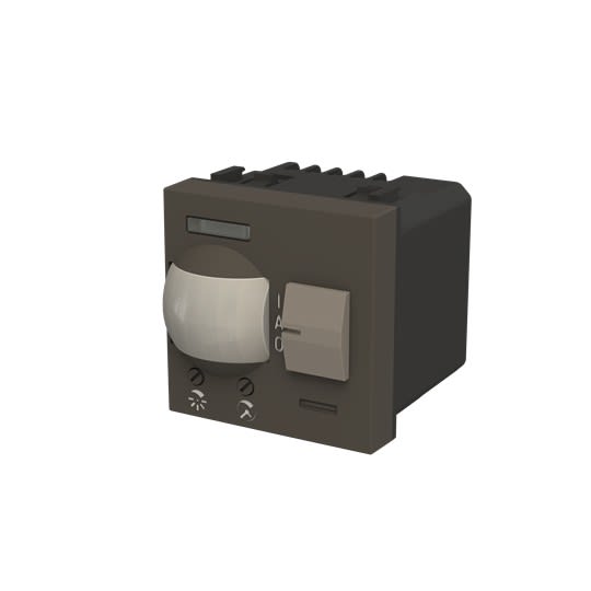 Couleur: anthracite.Tension nominale: 127 - 230 Vac ± 10% / 50 - 60 HzSorties: 1 normalement ouvert (NO). Potentiel libreMax. Puissance:- Incandescent: 1.800W à 230Vac / 1.000W à 127Vac- Halogène avec transformateur électronique o ferromagnétique: 750VA @ 230Vac / 400VA @ 127Vac- Lampes fluorescentes ou moteurs: 400VA @ 230Vac / 200VA @ 127VacPour la commutation automatique d'appareils en fonction du mouvement et de la luminosité.Avec sélecteur intégré pour ON-AUTOMATIC-OFF à l'avant.Temporisation d'extinction: 10 sec à 10 min ou impulsion courte durée 1 sec réglable (depuis la face avant).Portée de détection: 5 m radieuxNiveau de consigne d'éclairage réglable pour l'activation (par l'avant).Angle de détection: 110 °Hauteur de montage: 1,2 mCommande auxiliaire avec boutons poussoirs N2X04.XPlage de température (appareil): -10 ° C à 40 ° CTaille: 2 modules.