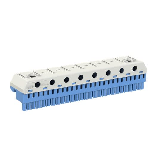 Borne enfichable rapide N pour support enfichable, montage sans outils à l'aide d'un équipement simple enfichable et verrouillable, code couleur clair: N = bleu, système de bornes flexible pour plusieurs circuits N, nombre de bornes: 26 x 1,5 4 mm² (technique de serrage à ressort) + 8 x 2,5 à 25 mm² (technique de raccordement à vis), dimensions extérieures H x L x P en mm: 32 x 147 x 31 mm, repérage simple des bornes (DIN VDE 0603 partie 1) avec bandes numérotées pré-imprimées et autocollantes.