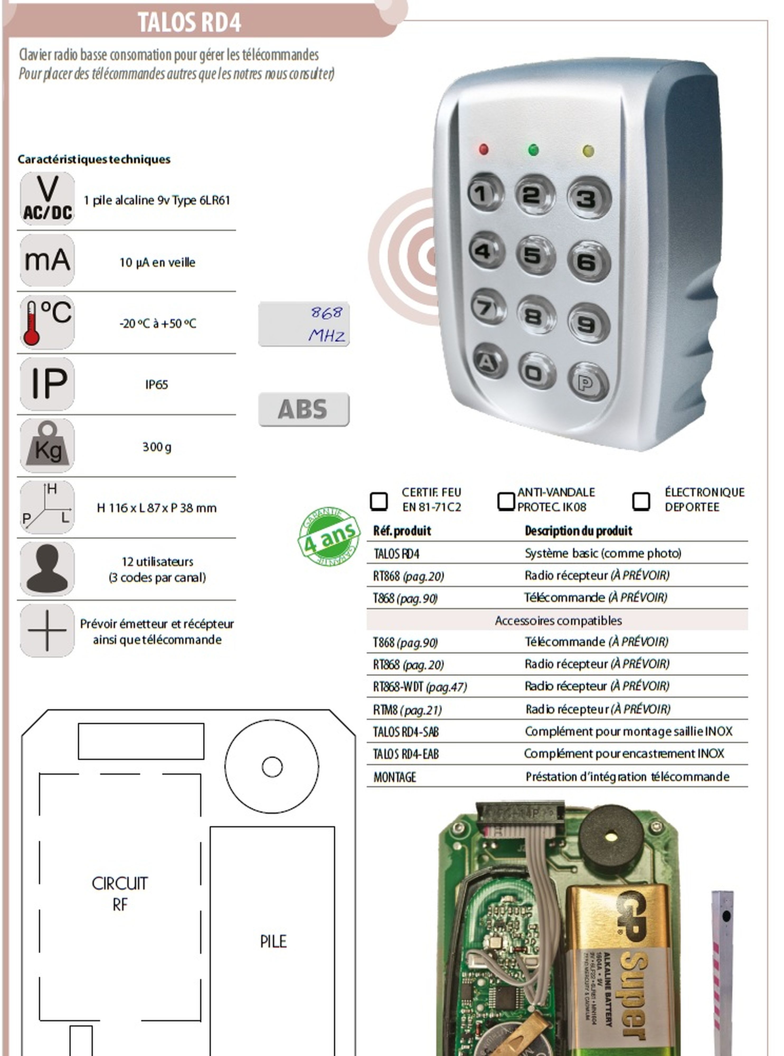 Clavier 4 voies radio abs technologie 868 mhz ip65 autoprotection ( prévoir la télécommande radio à intégrer )