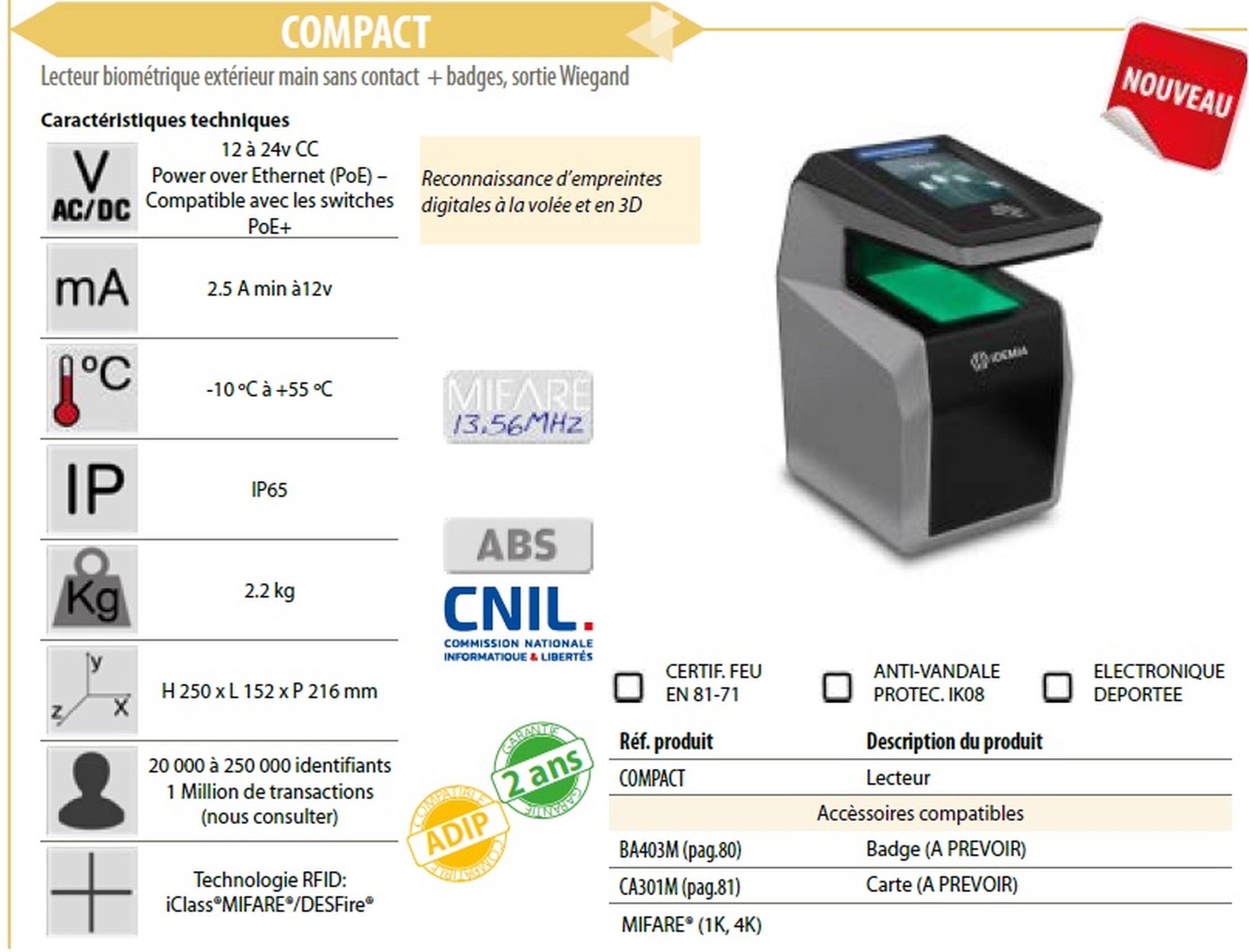 Acie Automatisme - Lecteur biométrique à reconnaissance de la main sans contact + lecteur mifare - MORPHOCOMPACTMD