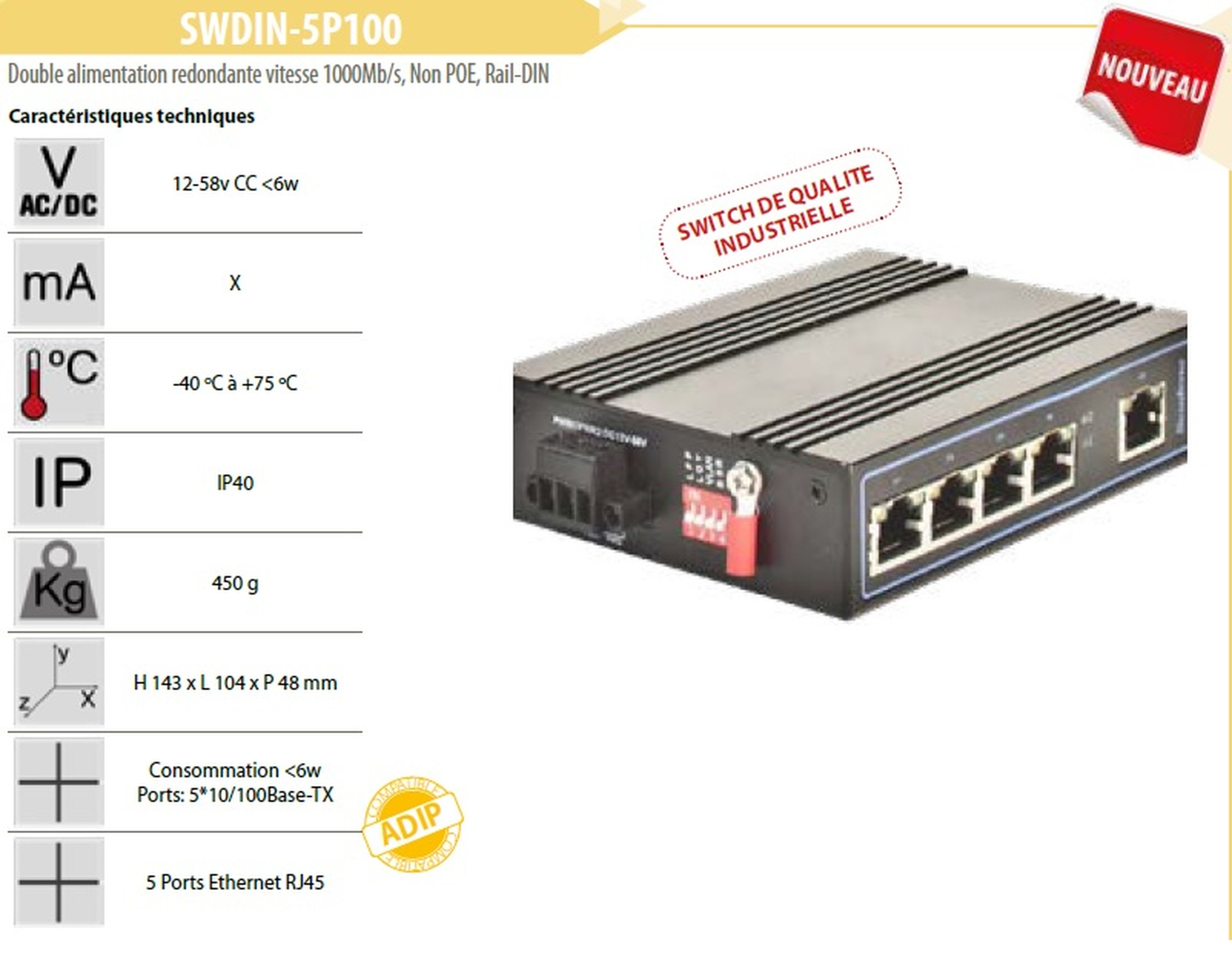 Acie Automatisme - Switch sur rail-din 5 portss double alimentation redondante - SWDIN-5P100