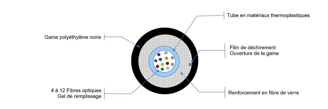Gamme ACOLAN - Câble OPTIQUE Structure - Central Loose Tube Standard - 12 Fibres optiques - OS2 G652D - armé fibre de verre - Conditionné en touret de 2100m - Gaine Polyéthylène - couleur Noir Tenue au feu, niveau RPC Fca Extérieur