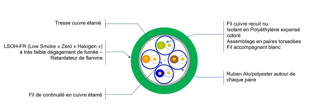 Gamme ACOLAN - Câble Catégorie 6A / EA - Structure S/FTP - 4paires - Jauge AWG23 - Qualifié à une fréquence de 550 Mhz - Conditionné en touret de 500m - Gaine LSOH-FR - couleur verte - Tenue au feu : niveau RPC B2ca