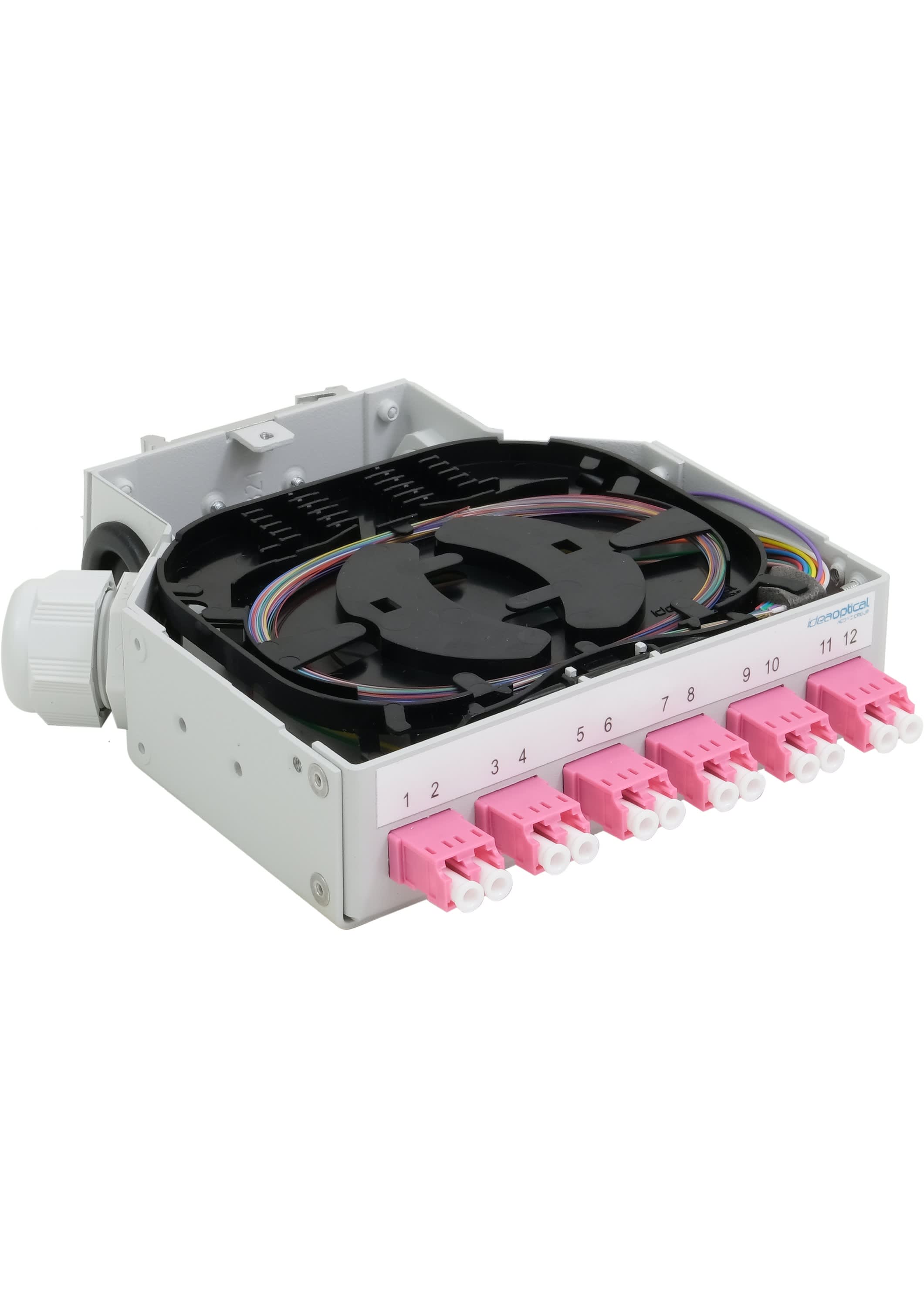 IBIC-12 : Boîtier de raccordement optique 12 Fibres - équipé de 12 pigtails LC/UPC G657A2, 6 raccords LCU duplex Bleu, 1 cassette d'épissurage 12 fibres, 1 presse-étoupes M20, 3 passe-fils DG M20, 1 kit pour rail DIN (4 positions possibles)