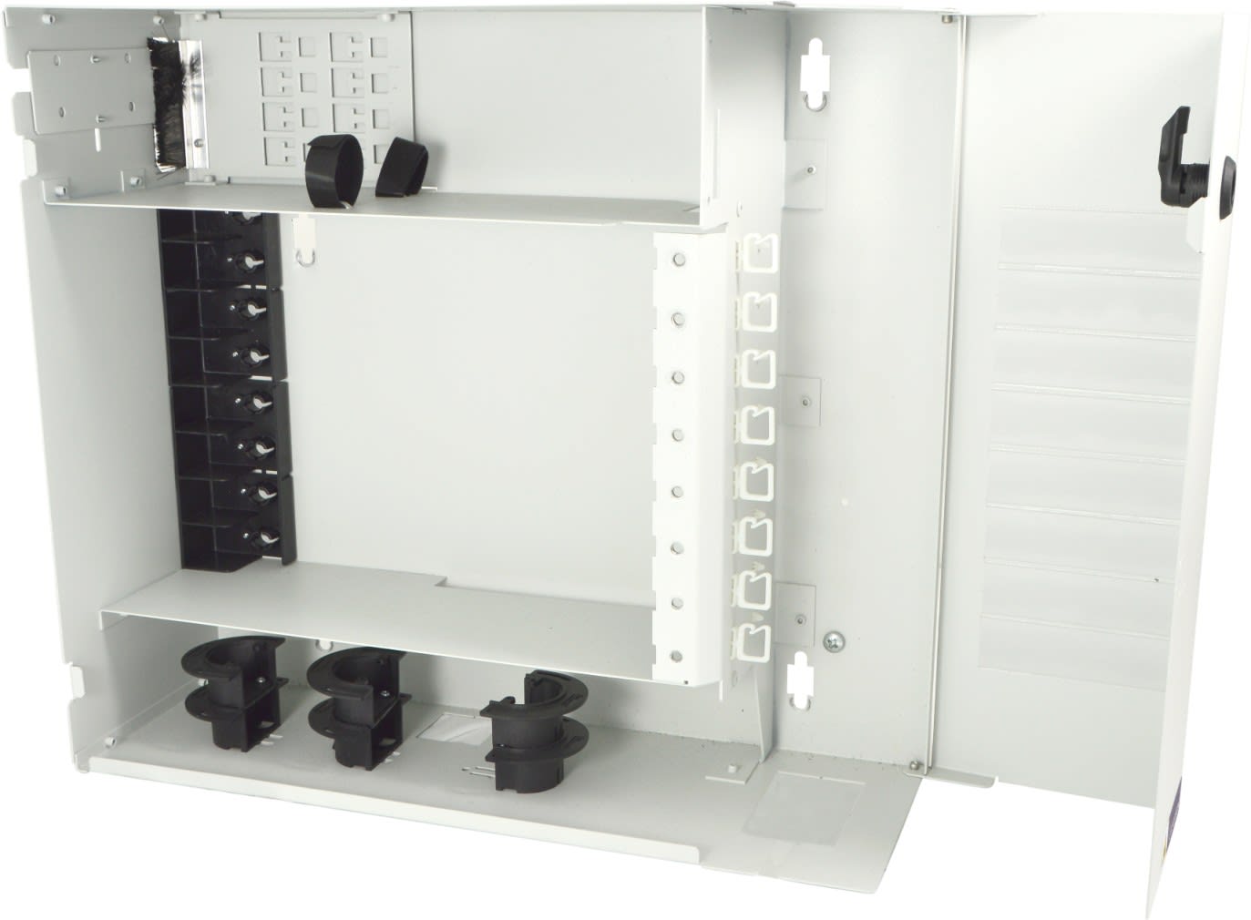 ICOR-UNI-8M : Coffret optique métal pour 8 modules iMOD-UNI-12 (non fournis), charnière droite, fermeture à clé, kit de fixation inclus + 1 ACL-8T : platine d'arrimage de câble avec 8 départs de gaines + 4 m de gaine annelée