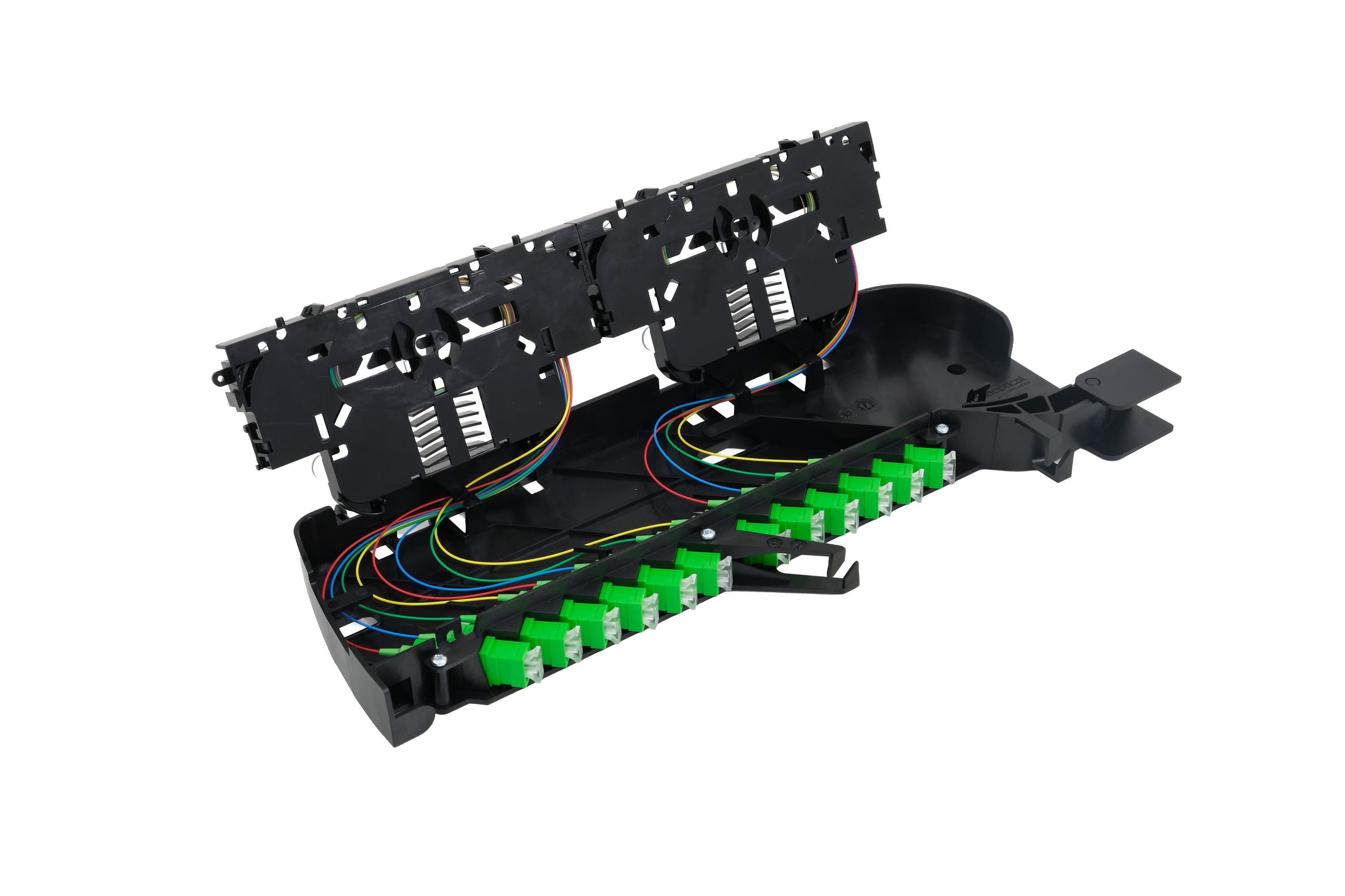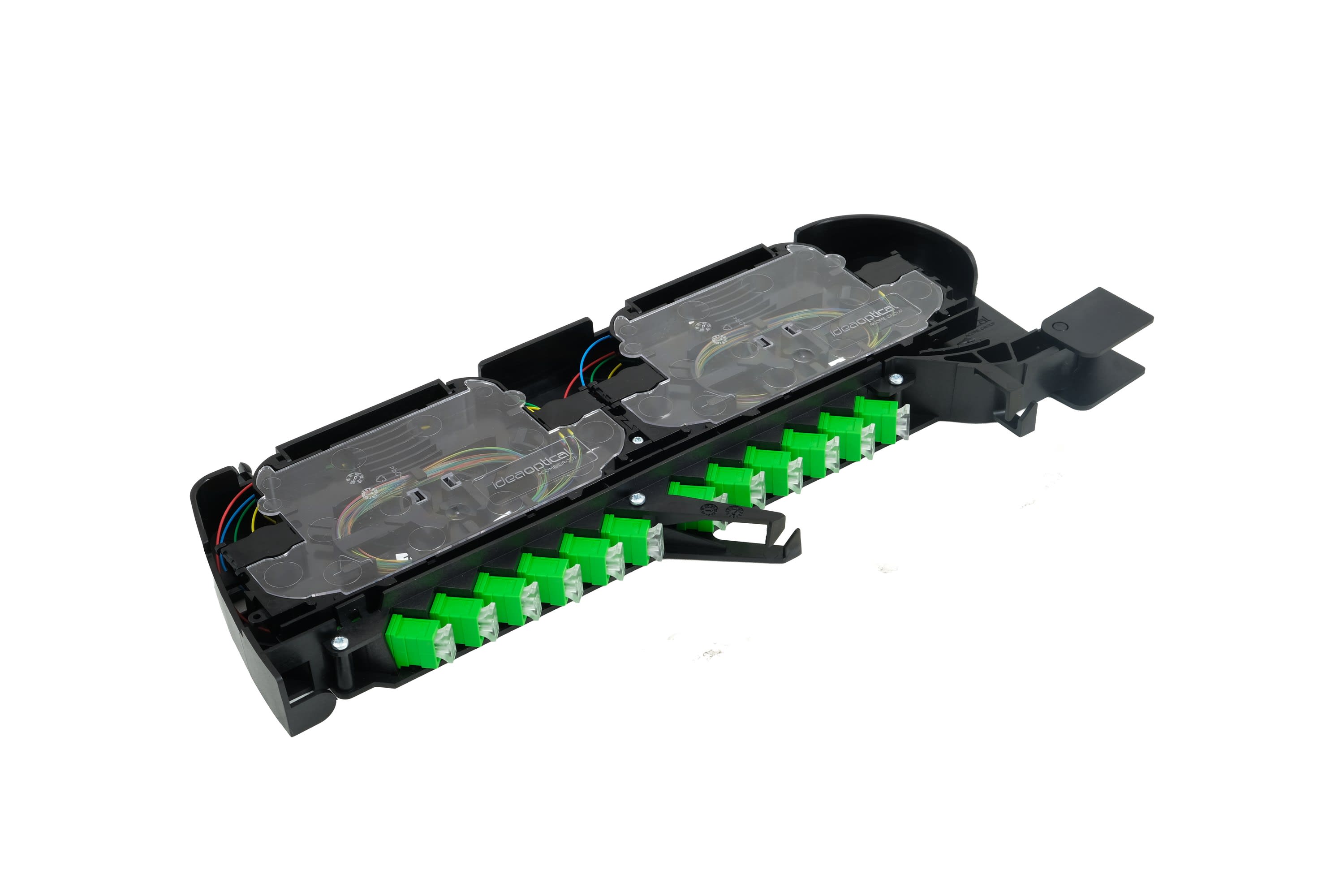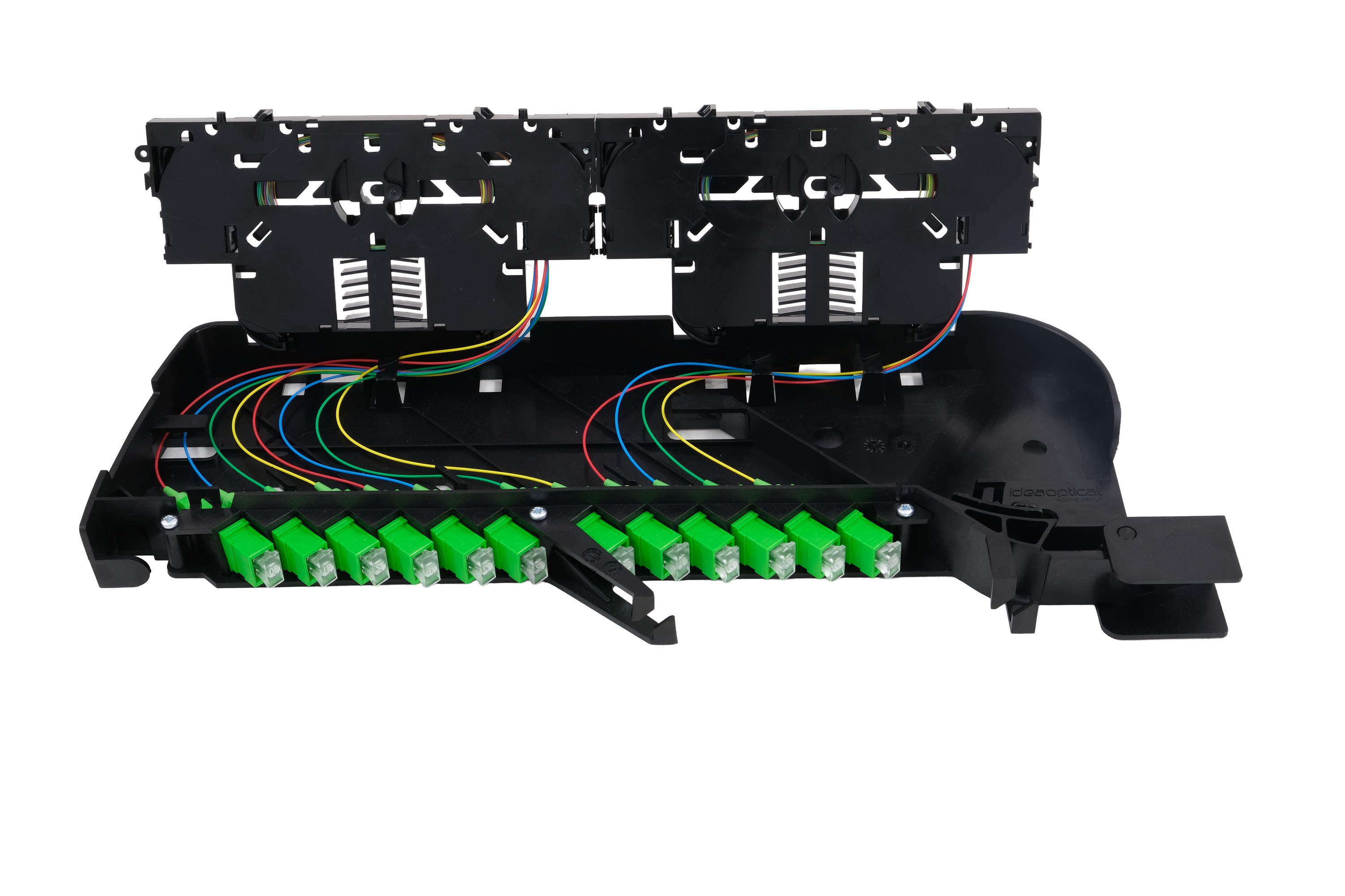 Module pivotant de brassage optique iMOD-UNI-12 - 12 Raccords SC-APC Simplex Verts - 12 Pigtails G657A2 code TELECOM - Charnière droite - Modules destinés aux coffrets iCOR-UNI