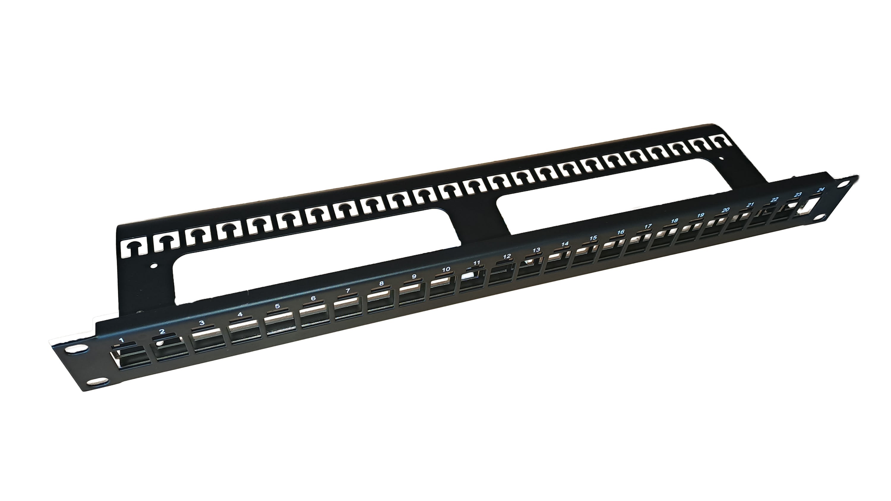 Panneau de brassage cuivre 24 ports pour connecteur RJ45 Keystone, intégration en baie 19 pouces, hauteur 1U, Sortie droite, mise à la masse par contact sur les montants, finition peinture noire