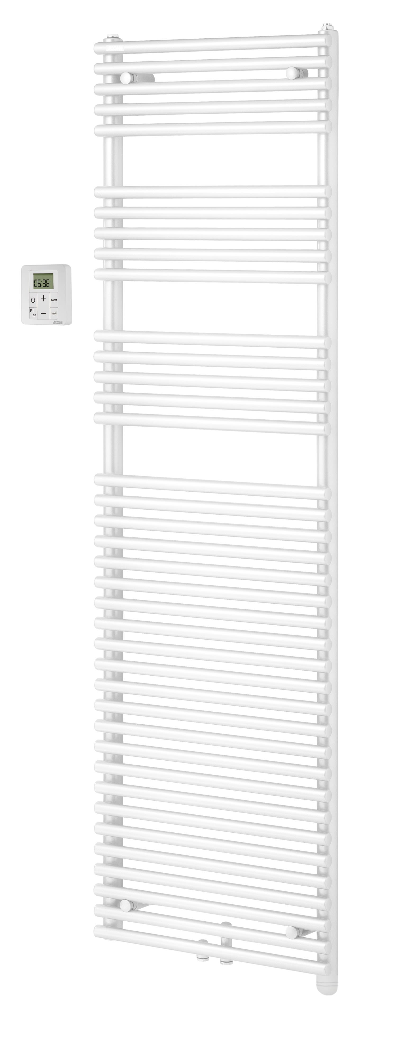 Radiateur sèche-serviettes ACOVA Cala Symétrique Mixte commande radiofréquence RF, puissance 551W (dT50) + 300W, hauteur 1186 mm, largeur 446 mm, raccordement par le bas, entraxe 50 mm centré, Aller/Retour réversible, Blanc RAL 9016